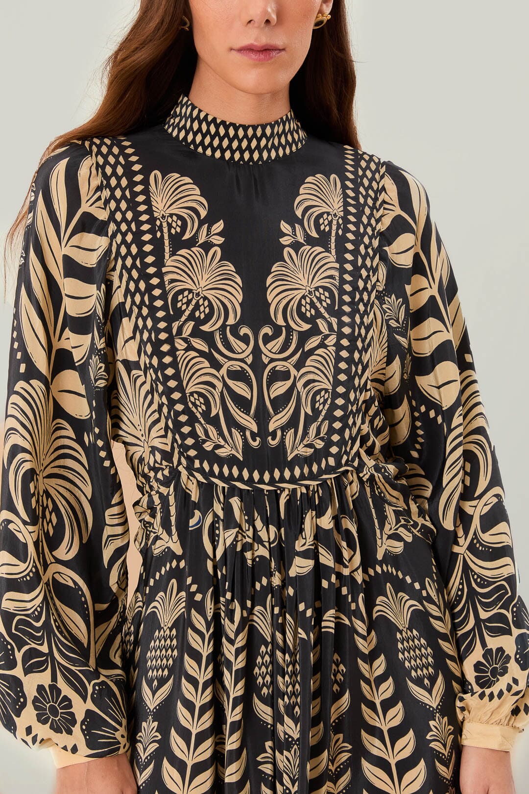 Embrace the essence of tropical allure with the Navy Blue Ainika Tropical Splendor Maxi Dress from FARM Rio. This dress features a charming high neckline and an enchanting botanical motif, blending bold florals with flowing sleeves for a graceful silhouette. The intricate patterns evoke the vibrancy of tropical landscapes, making it a perfect blend of elegance and playfulness. Let your style bloom with every step.