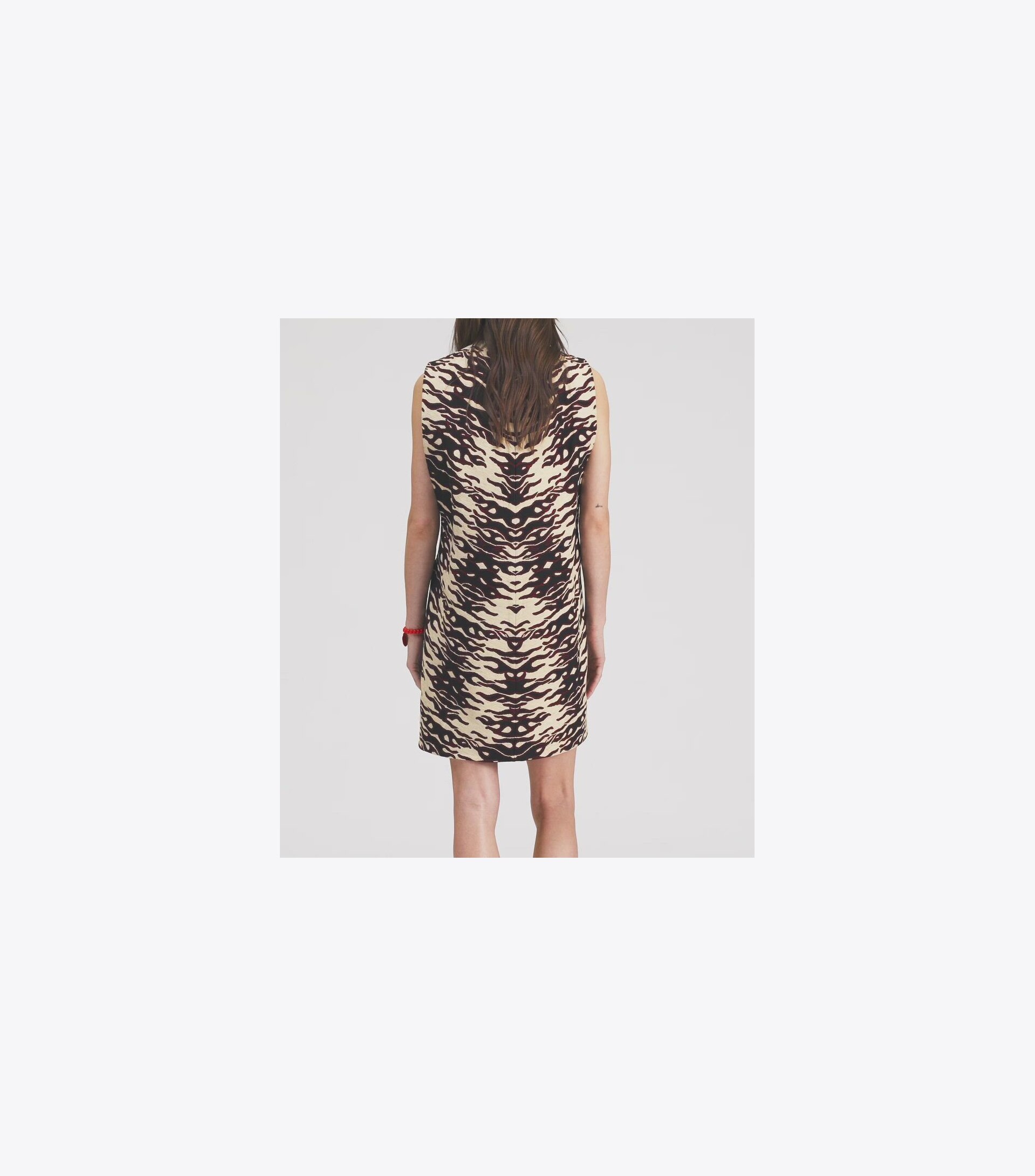 Seen on the Spring ’25 runway, the structured shift is made of bonded chenille jacquard, creating a lightweight yet sculptural silhouette with minimal stitching. A graphic print composed of abstracted swimmers recalls the season’s athletic theme. The dress has a generous cut for comfort and freedom of movement.