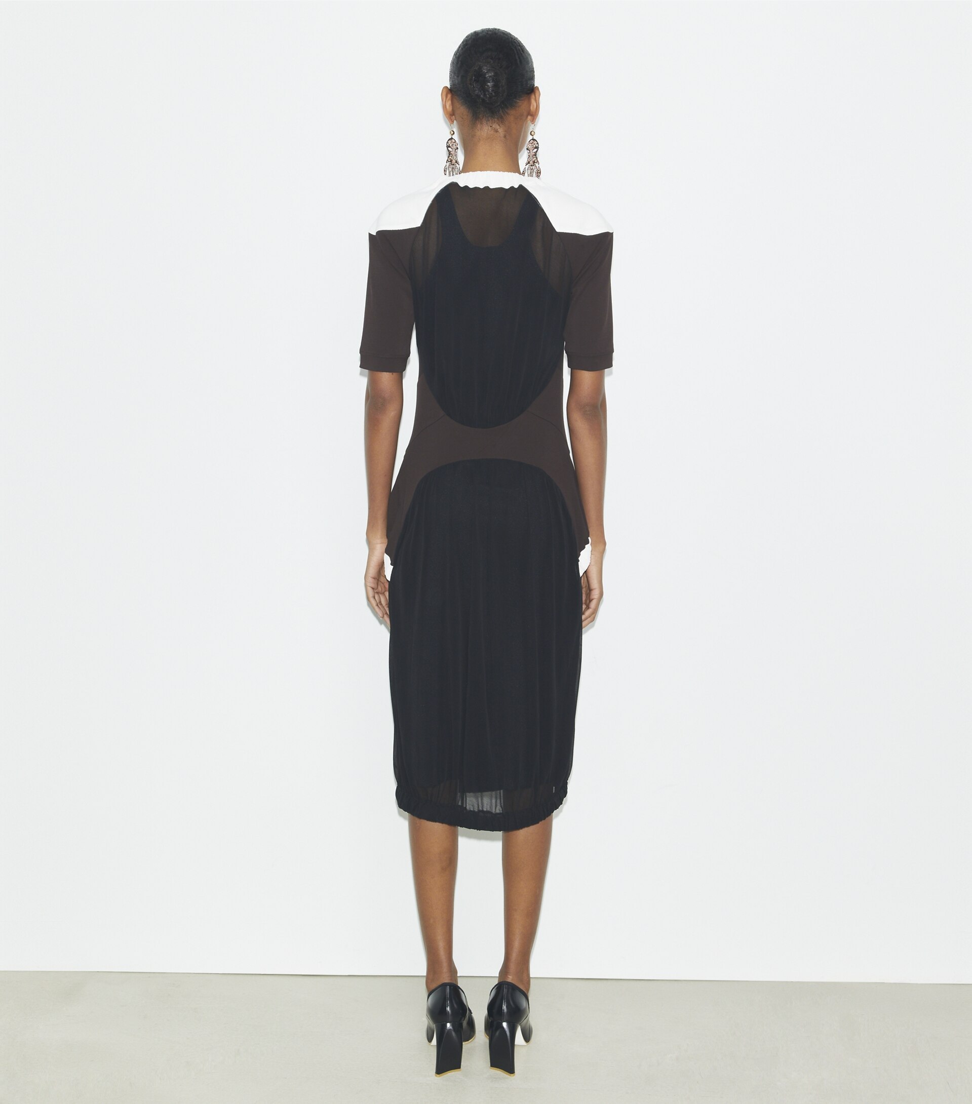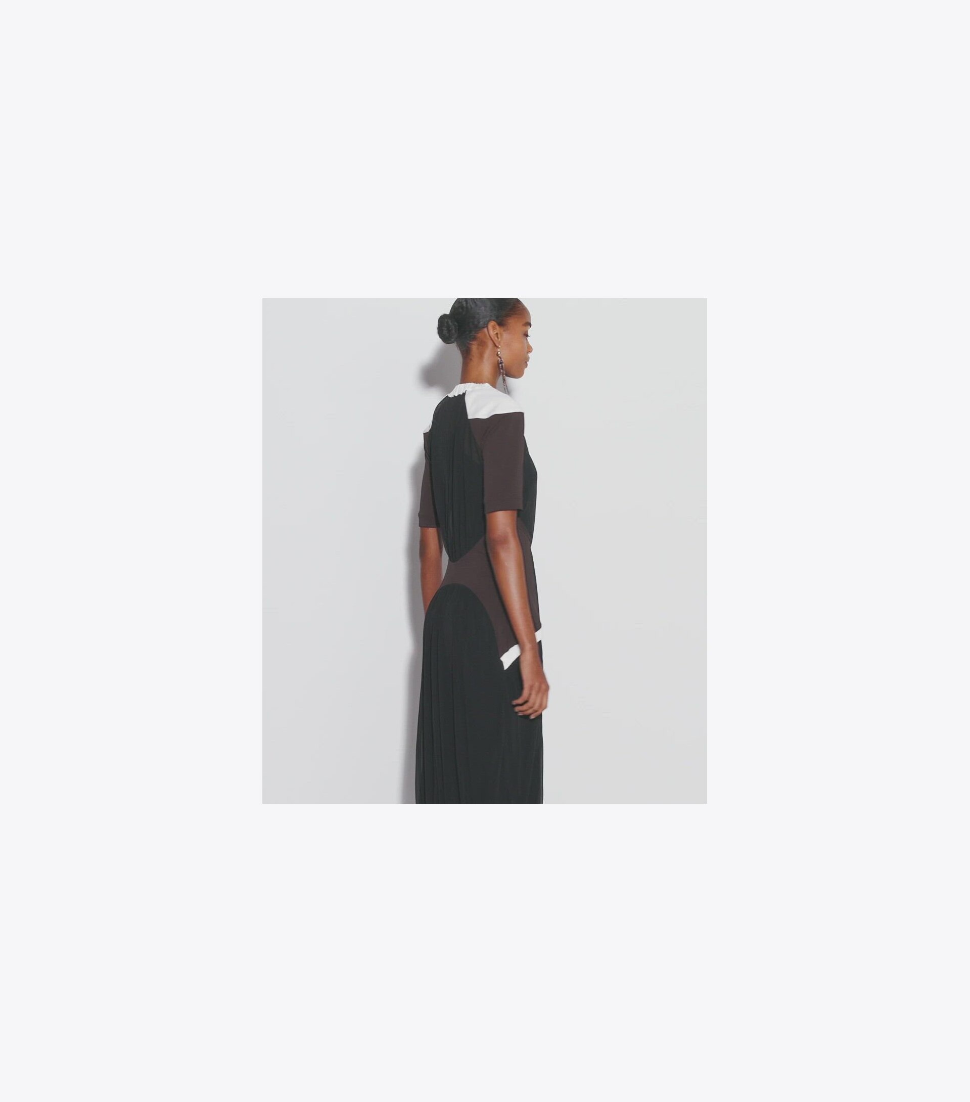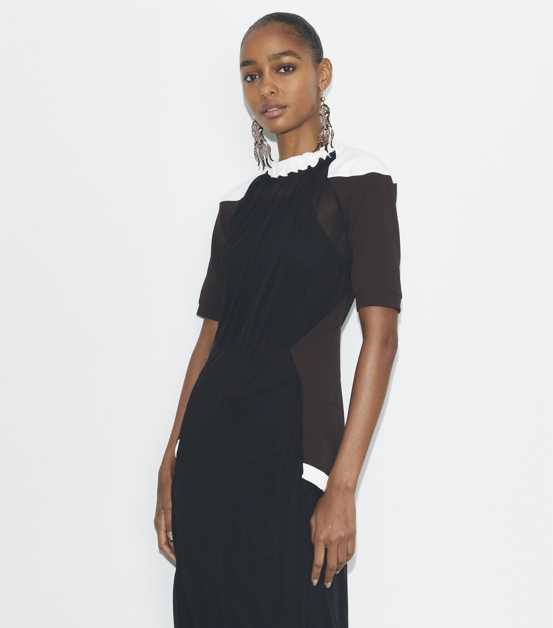 Seen on the Spring ’25 runway, the colorblock sheer dress is crafted in an Italian jersey with a bias knit that drapes beautifully. Contrast shoulders and side panels highlight the body’s natural curves, echoing a collection inspired by fluidity and movement.