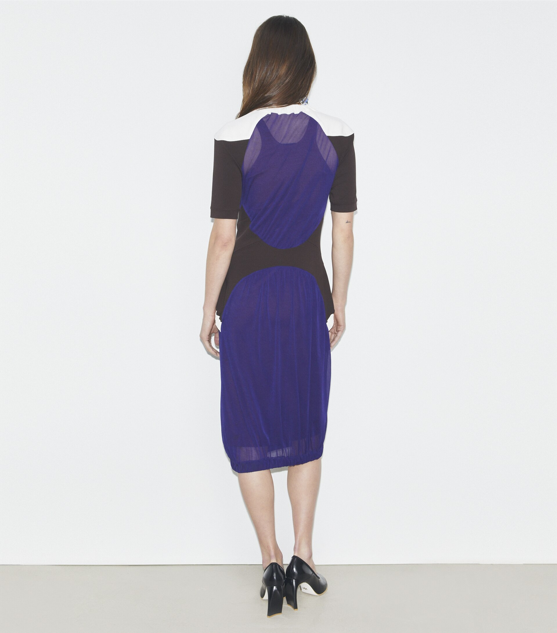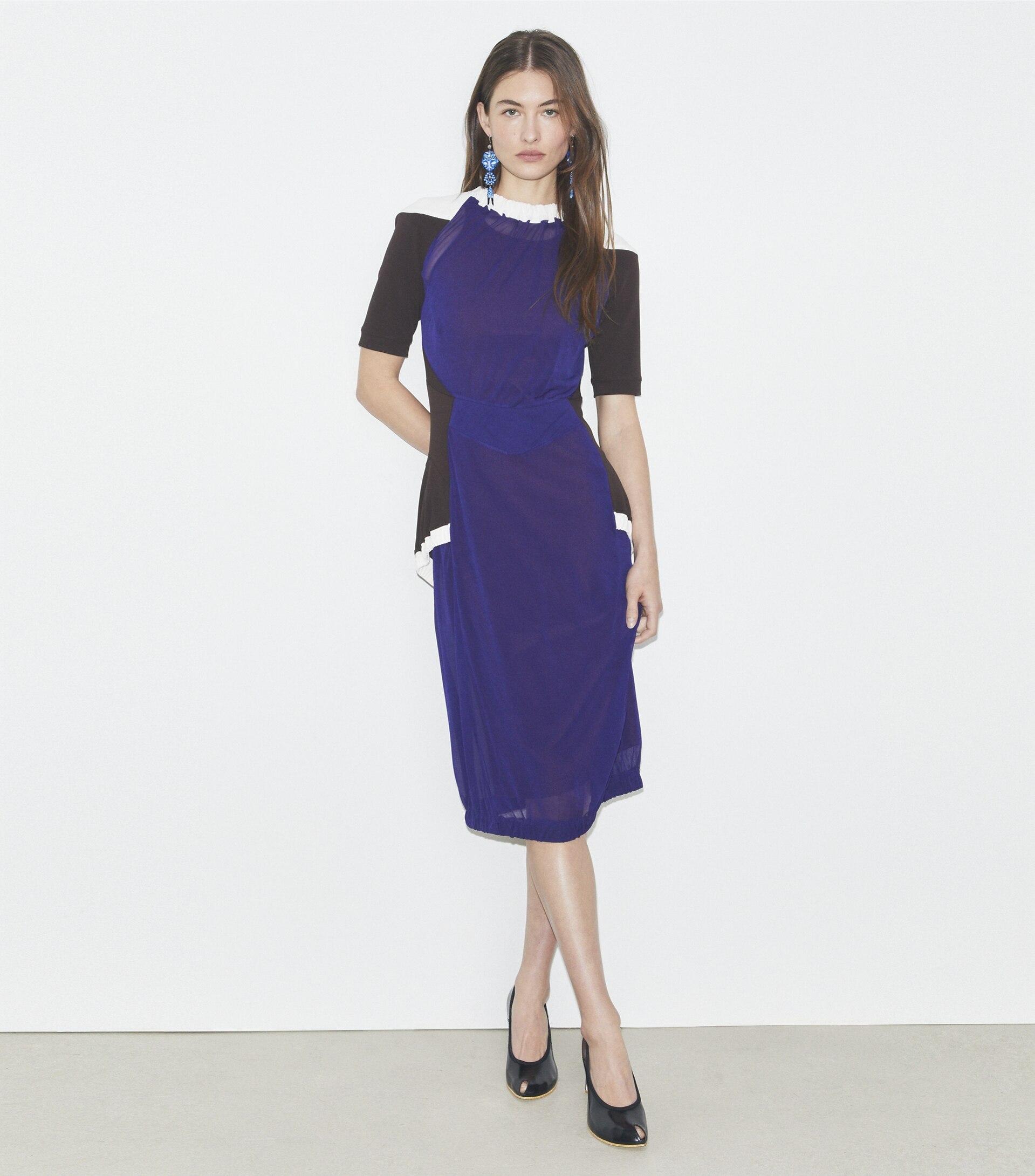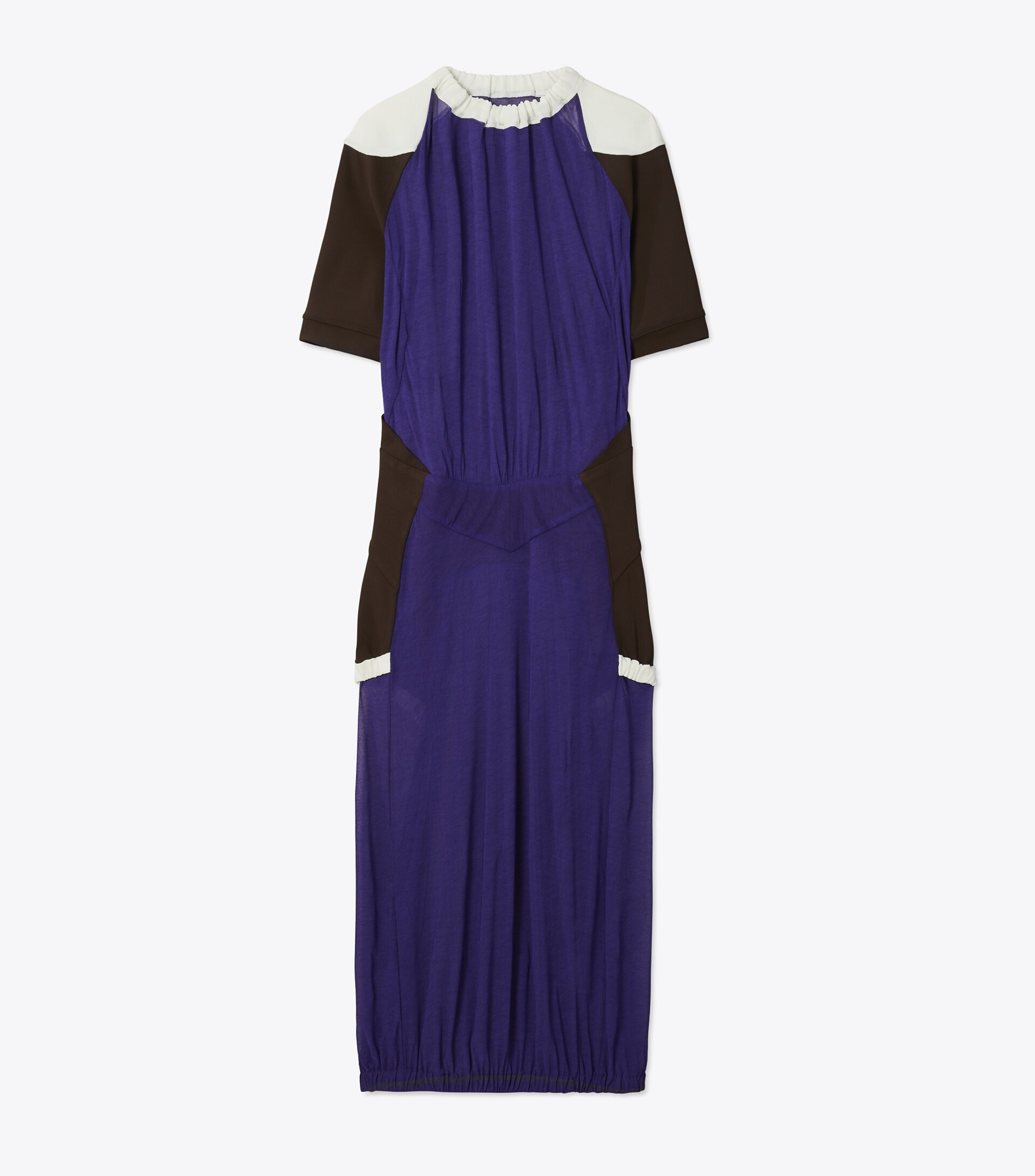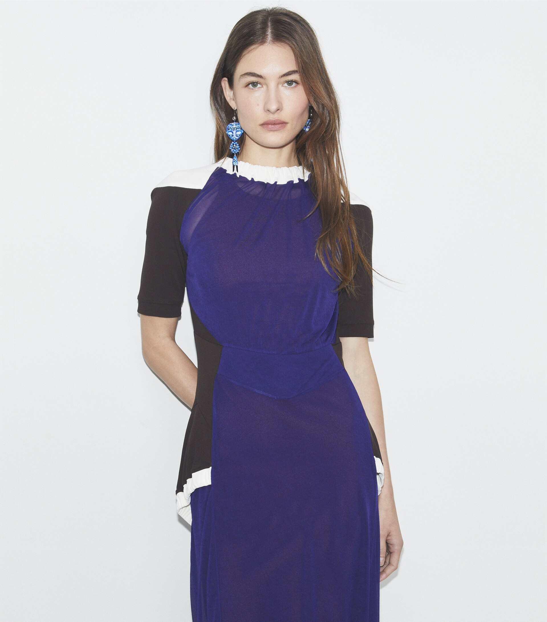 Seen on the Spring ’25 runway, the colorblock sheer dress is crafted in an Italian jersey with a bias knit that drapes beautifully. Contrast shoulders and side panels highlight the body’s natural curves, echoing a collection inspired by fluidity and movement.