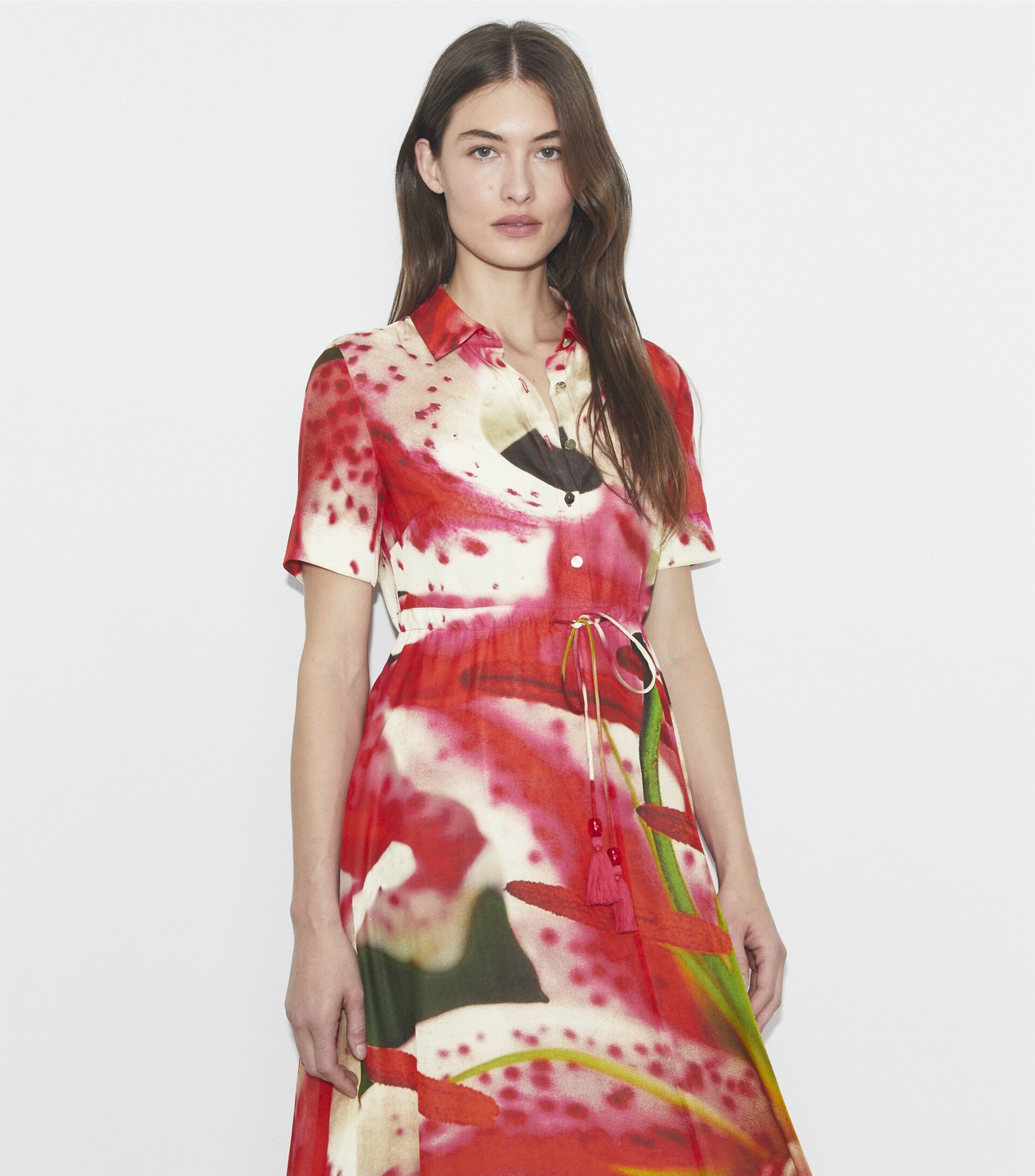 A feminine silhouette is relaxed and versatile. The cotton shirtdress features metal buttons and side seam pockets. A built-in drawstring with beaded tassel cord ends can be worn loose or cinched at the waist.
