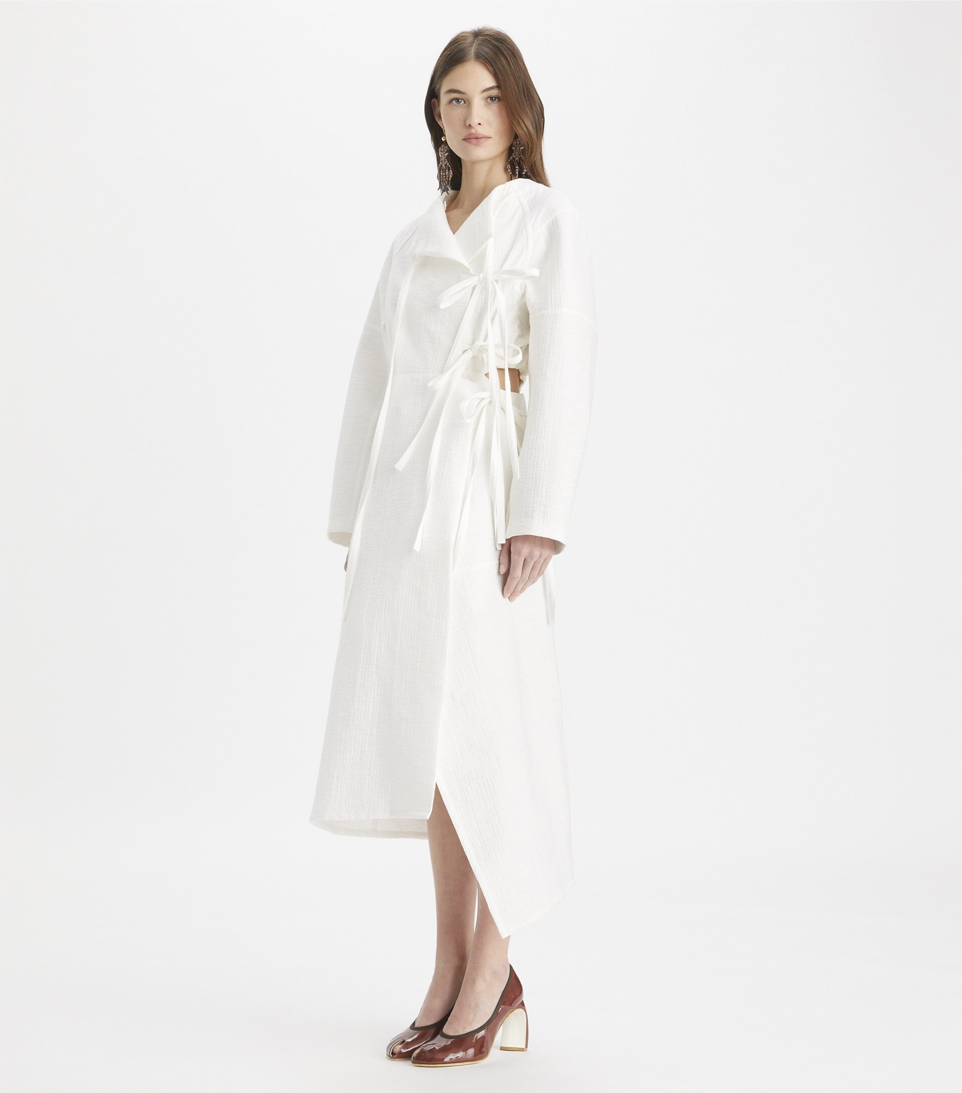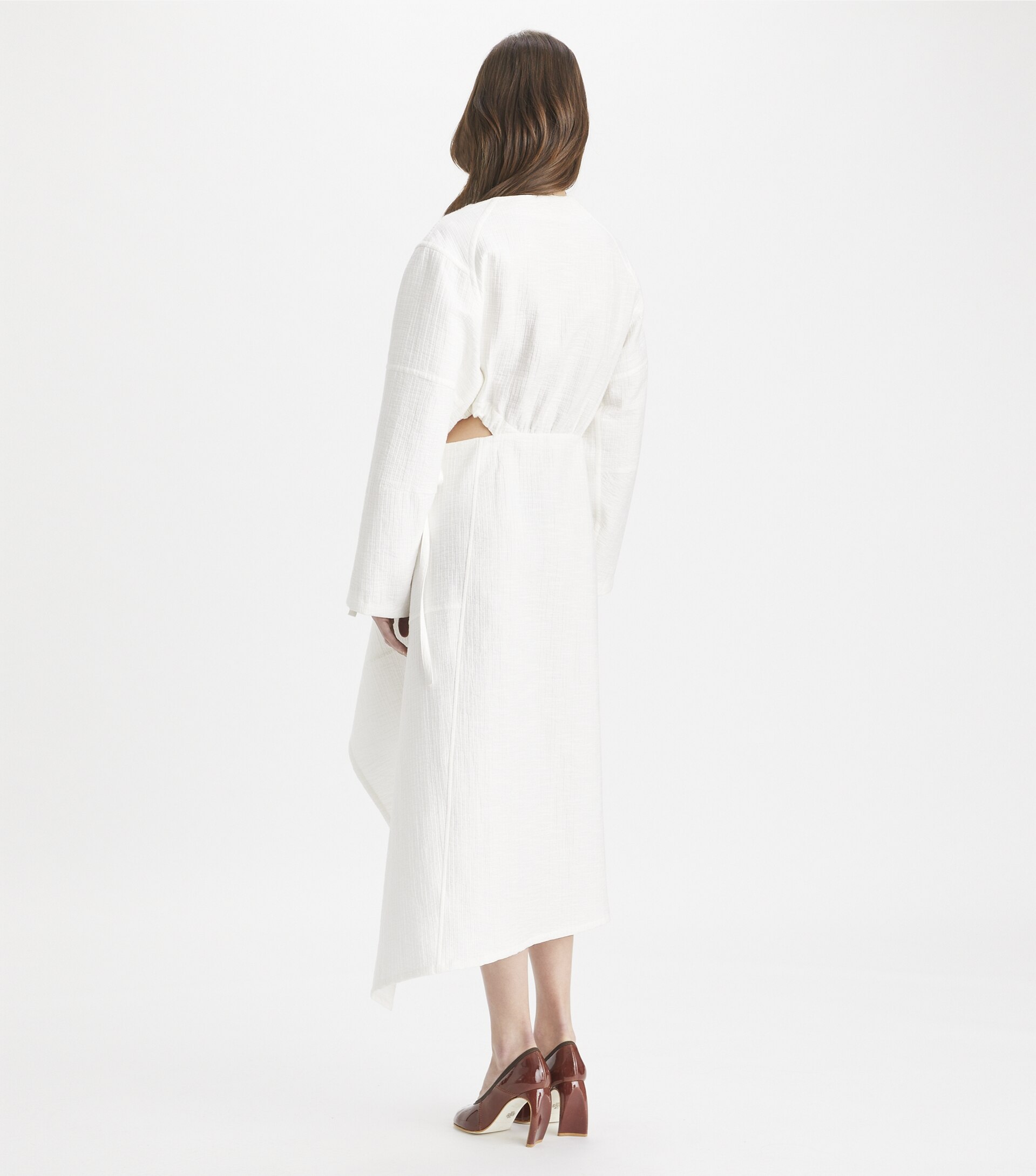 The cotton wrap dress was seen on our Spring ’25 runway, drawing inspiration from Tory’s vintage pieces and the elegance of traditional Judo jackets. Woven at a renowned Italian mill known for its beautiful fabrics, the double-faced cotton jacquard is lightly quilted for subtle texture and soft structure. The flattering silhouette reveals a sliver of waist with ties that can be adjusted for the perfect fit.