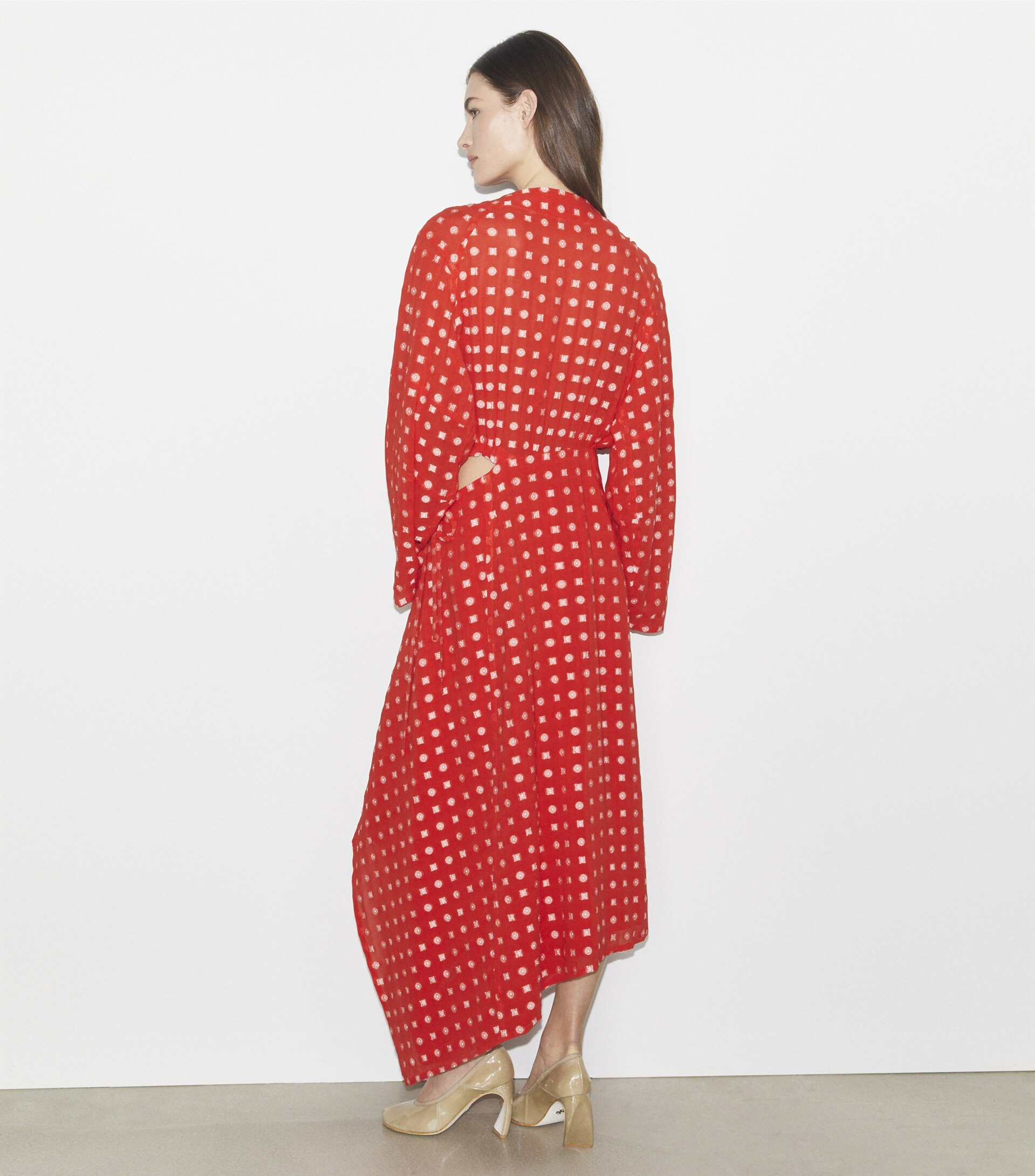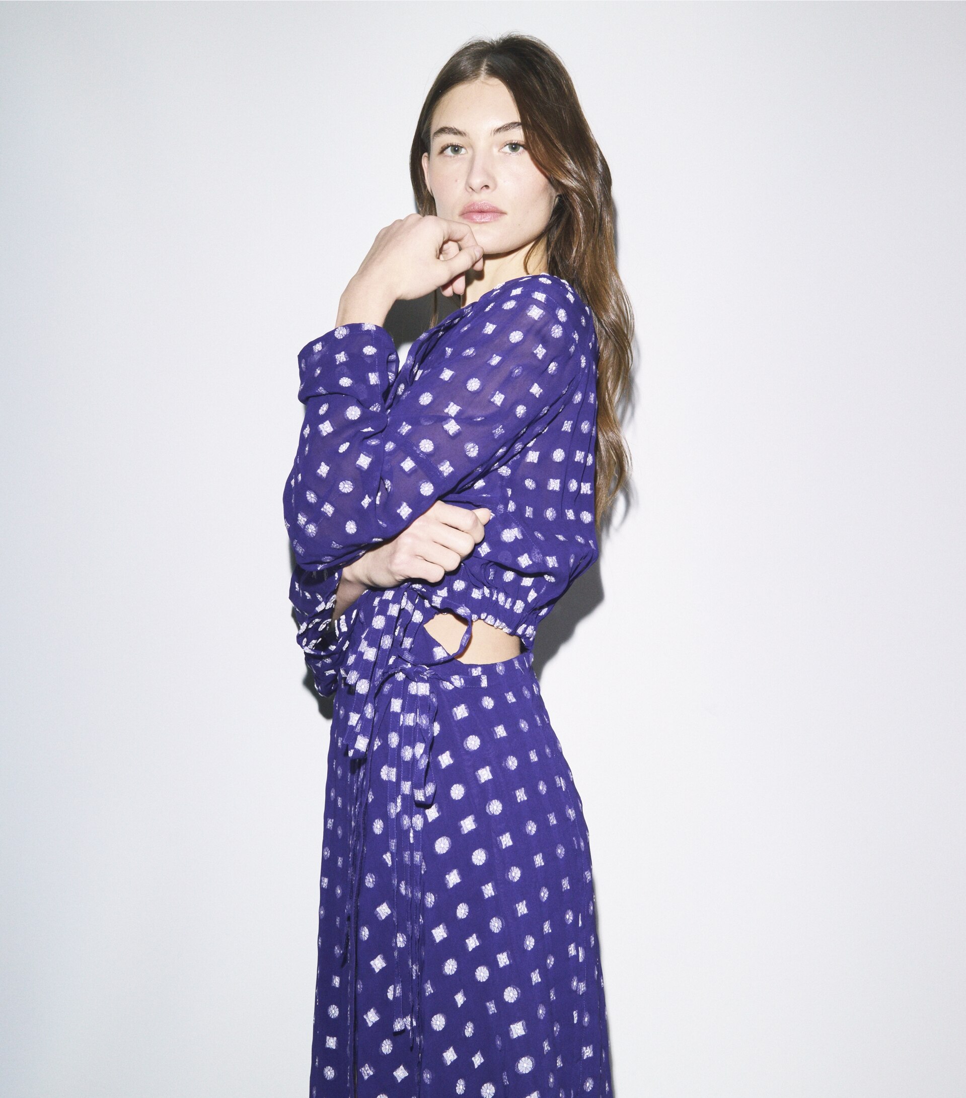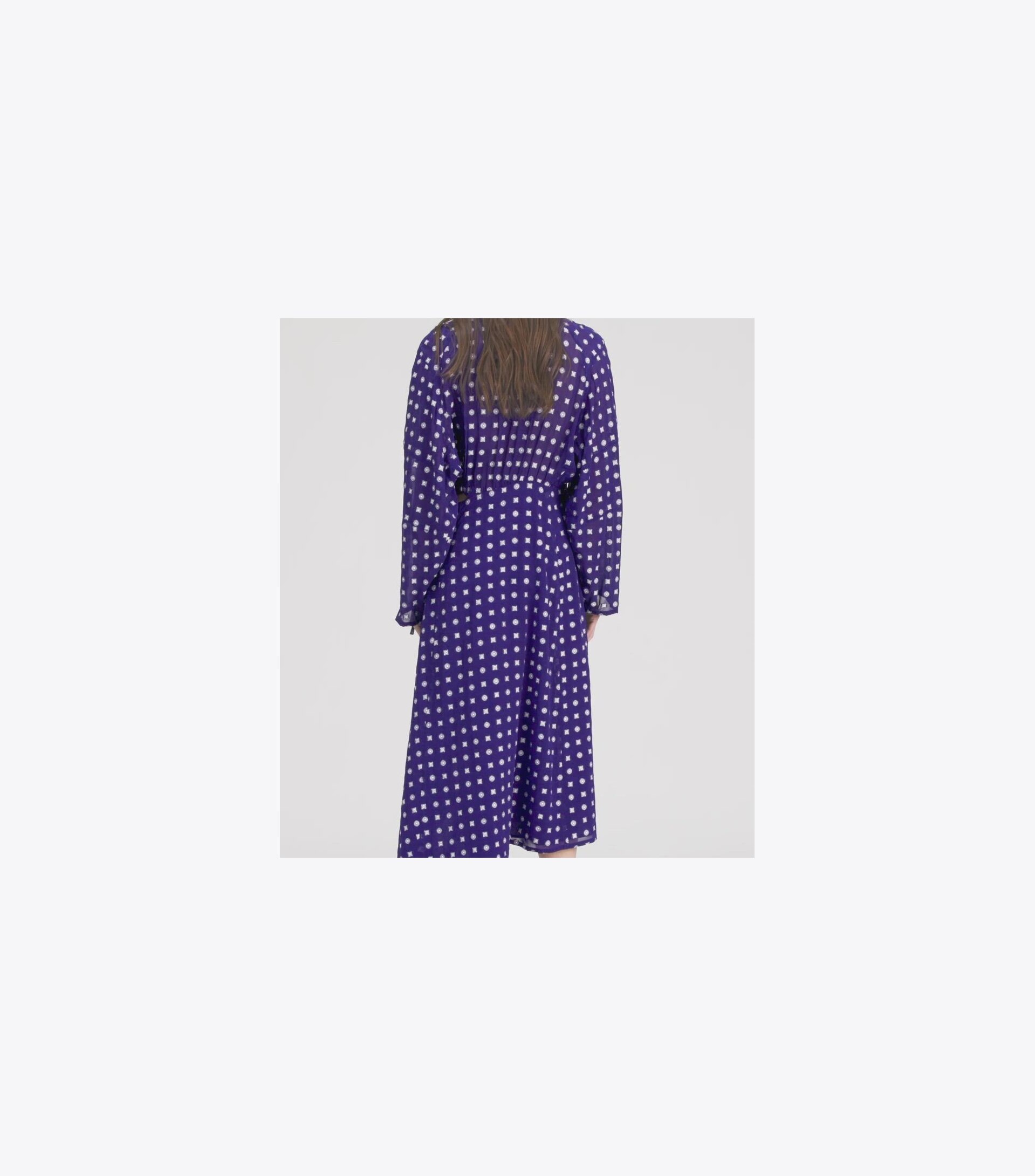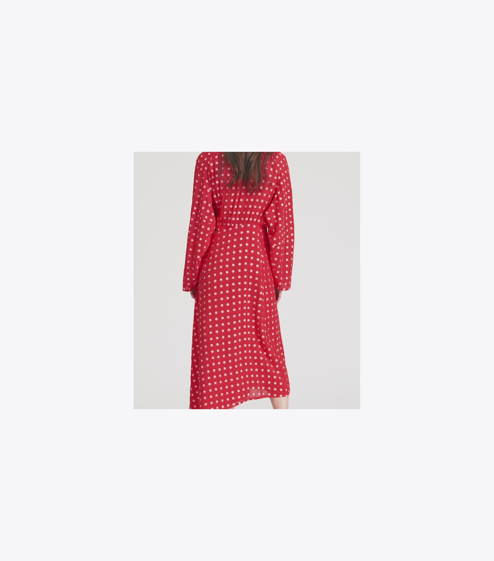 The jacquard wrap dress was seen on our Spring ’25 runway, drawing inspiration from Tory’s vintage pieces and the elegance of traditional Judo jackets. Woven at a renowned Italian mill known for its beautiful fabrics, the vibrant chiffon fil coupé has a graphic floral pattern. The flattering silhouette reveals a sliver of waist with ties that can be adjusted for the perfect fit.