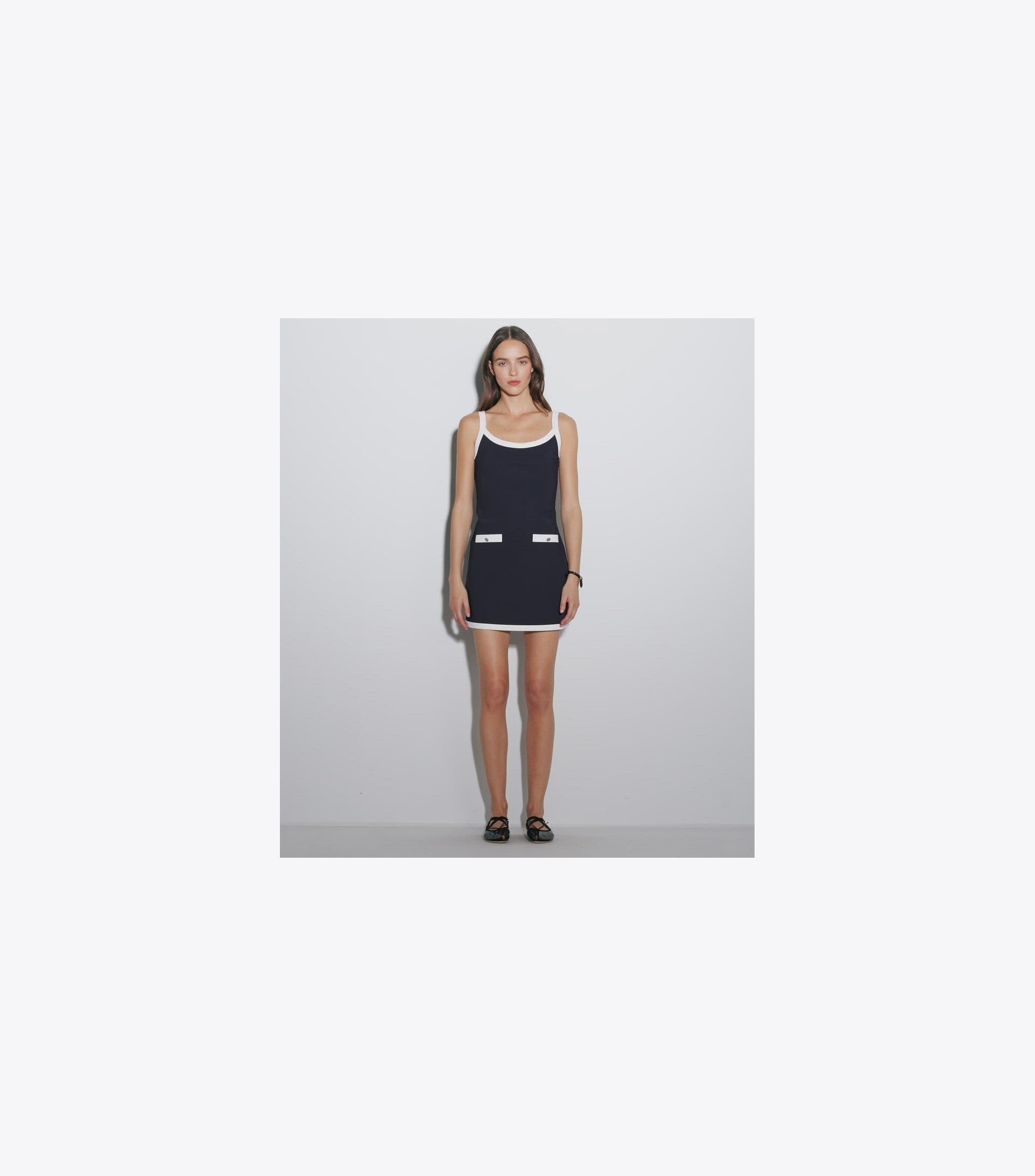 An A-line dress with thin shoulder straps is detailed with contrast binding and front welt pockets. The mini length silhouette features removable inner shorts with an interior ball pocket, adding coverage and convenience.