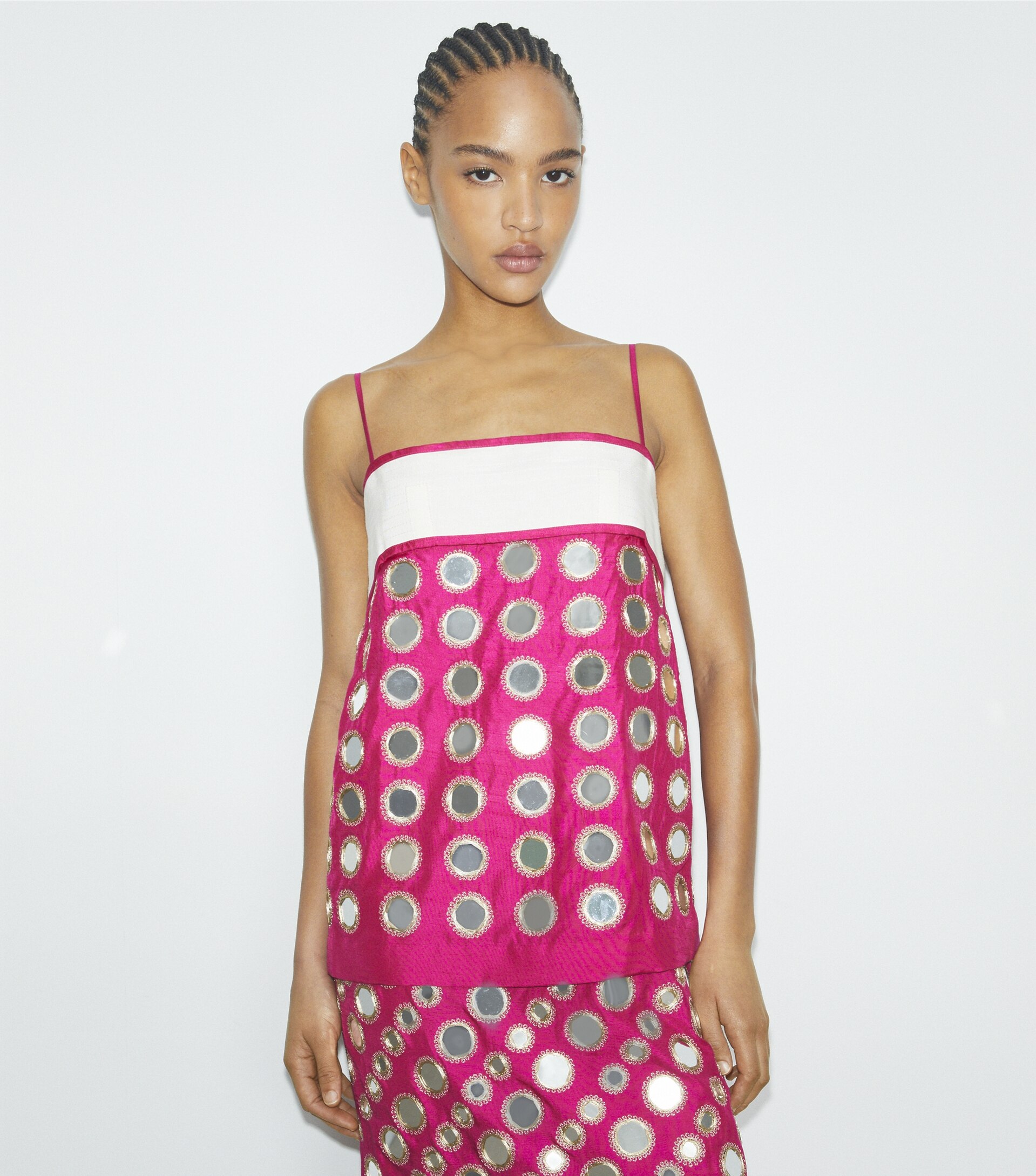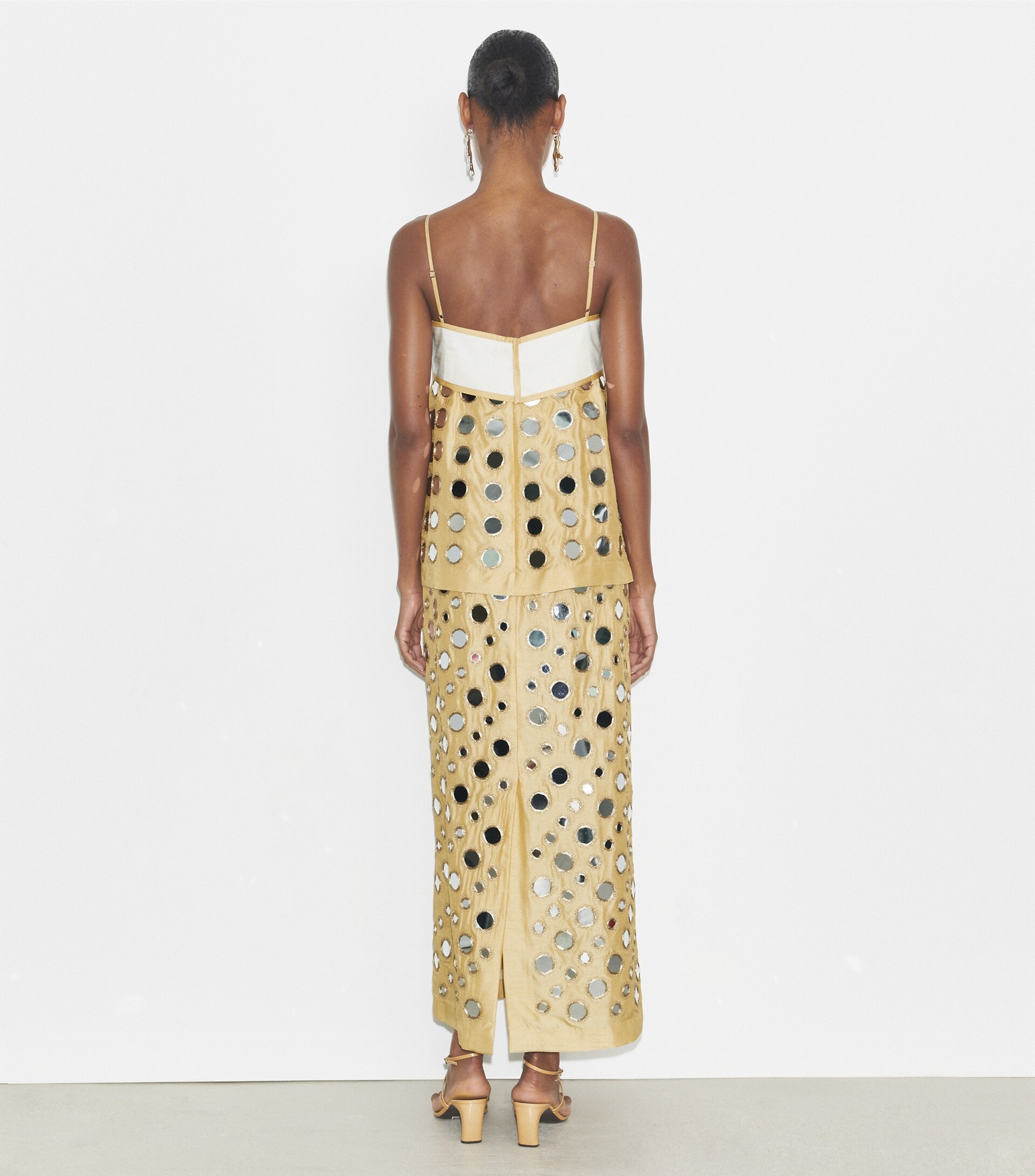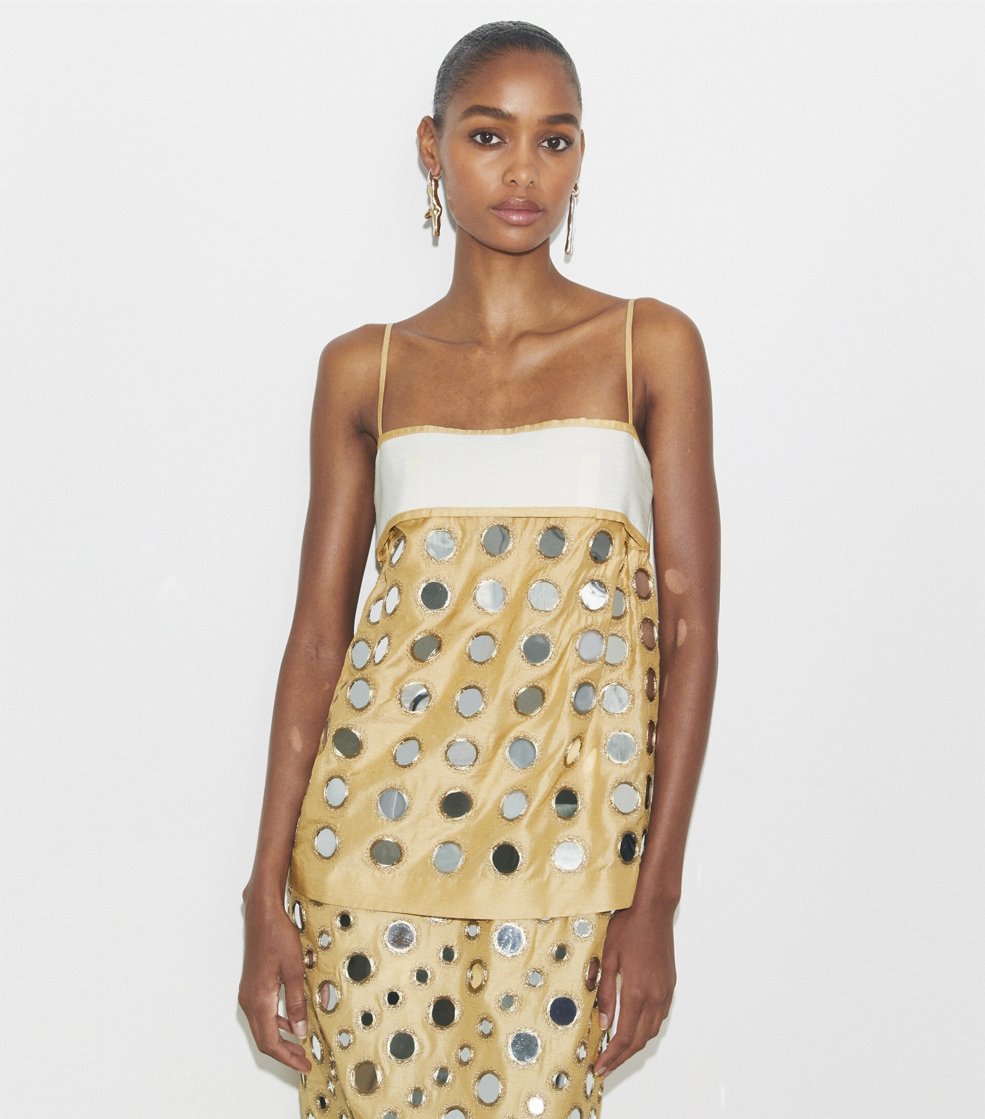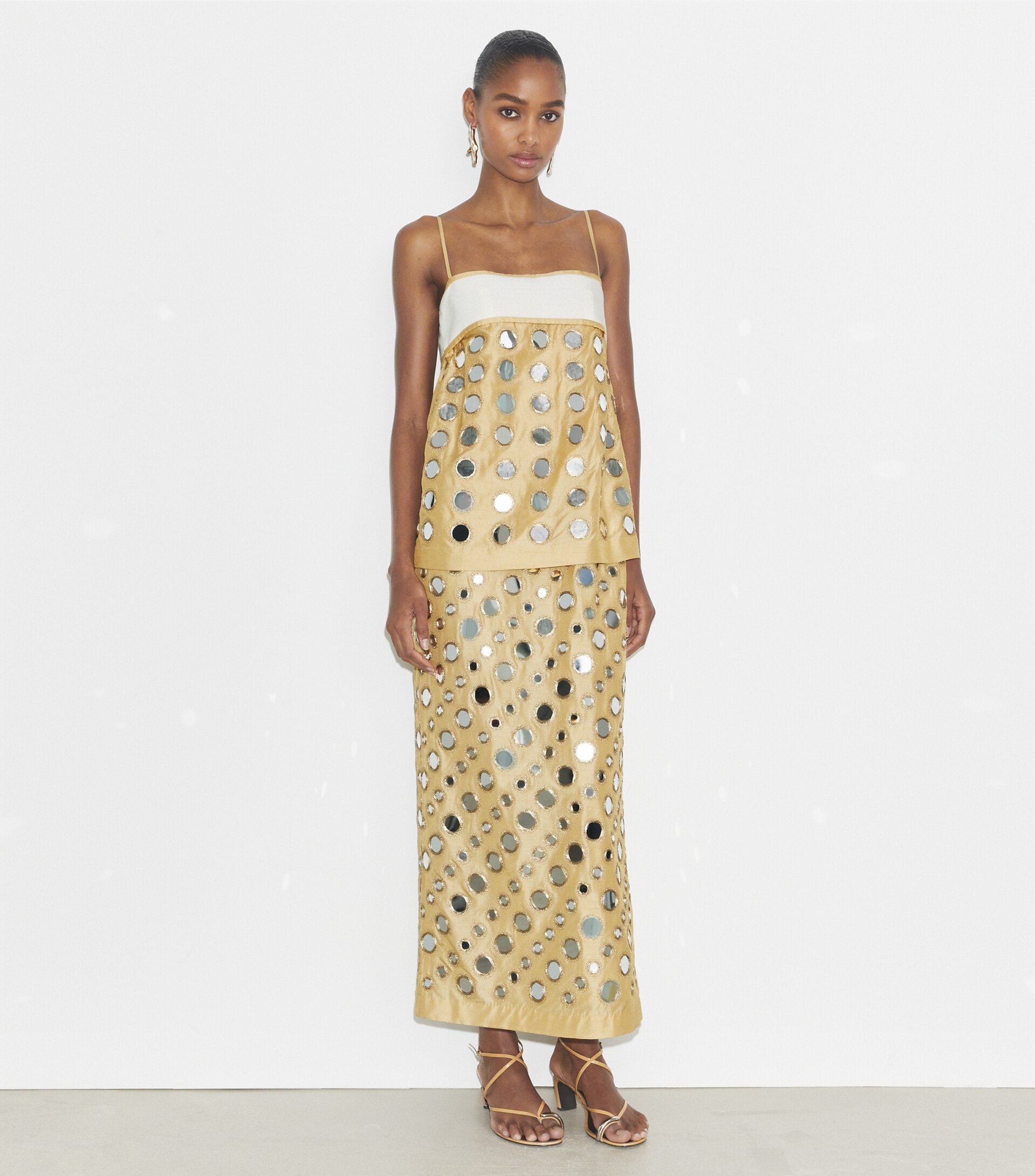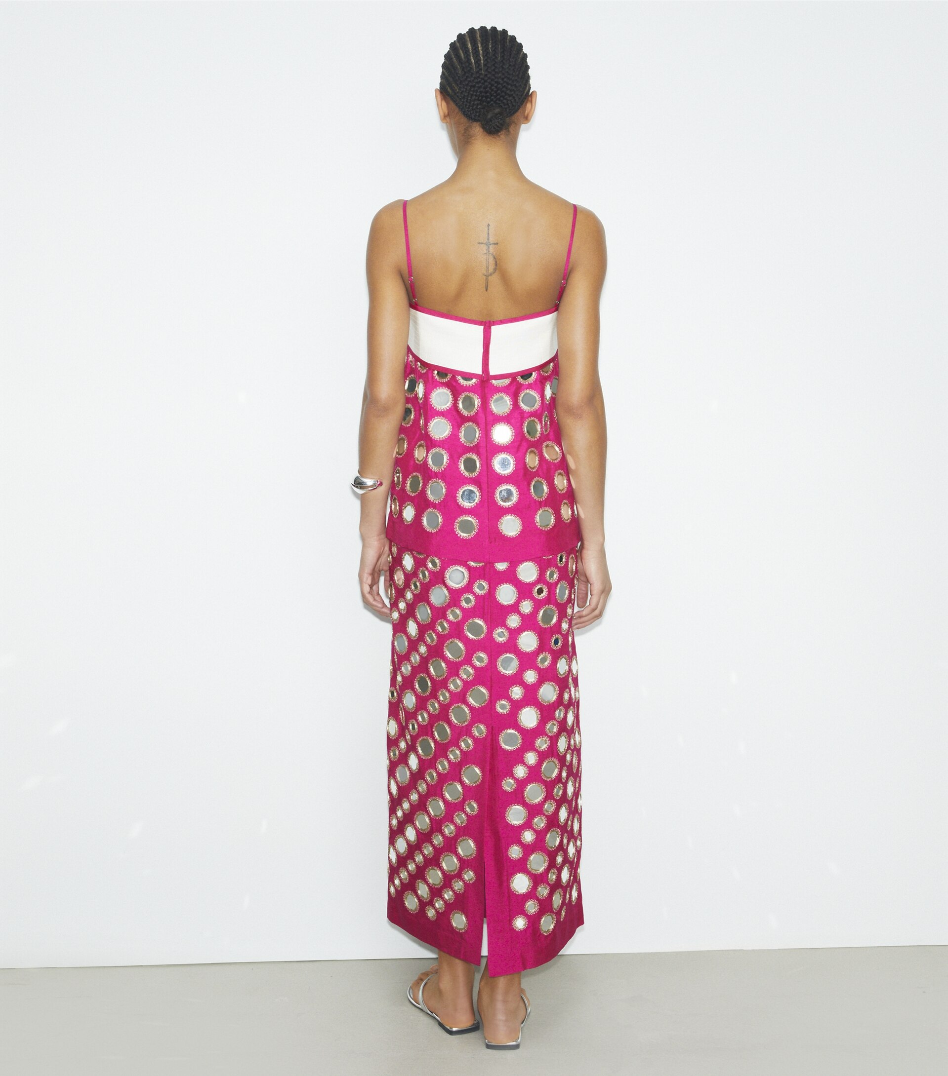 Inspired by a vintage jacket, the dress is crafted in India from a luxurious blend of cupro and viscose that has a silk-like drape. Mirrored paillettes are embroidered by hand. The layered piece is effortlessly chic for day or night.