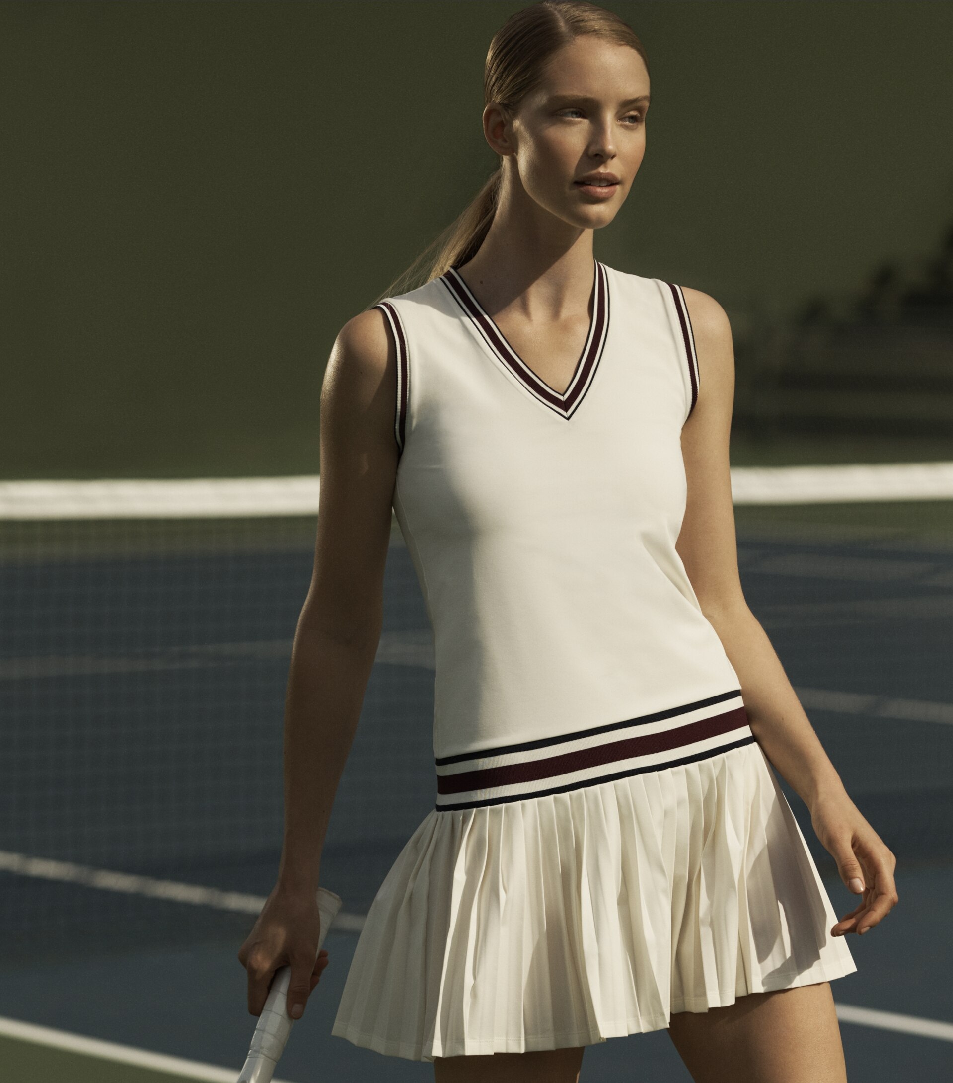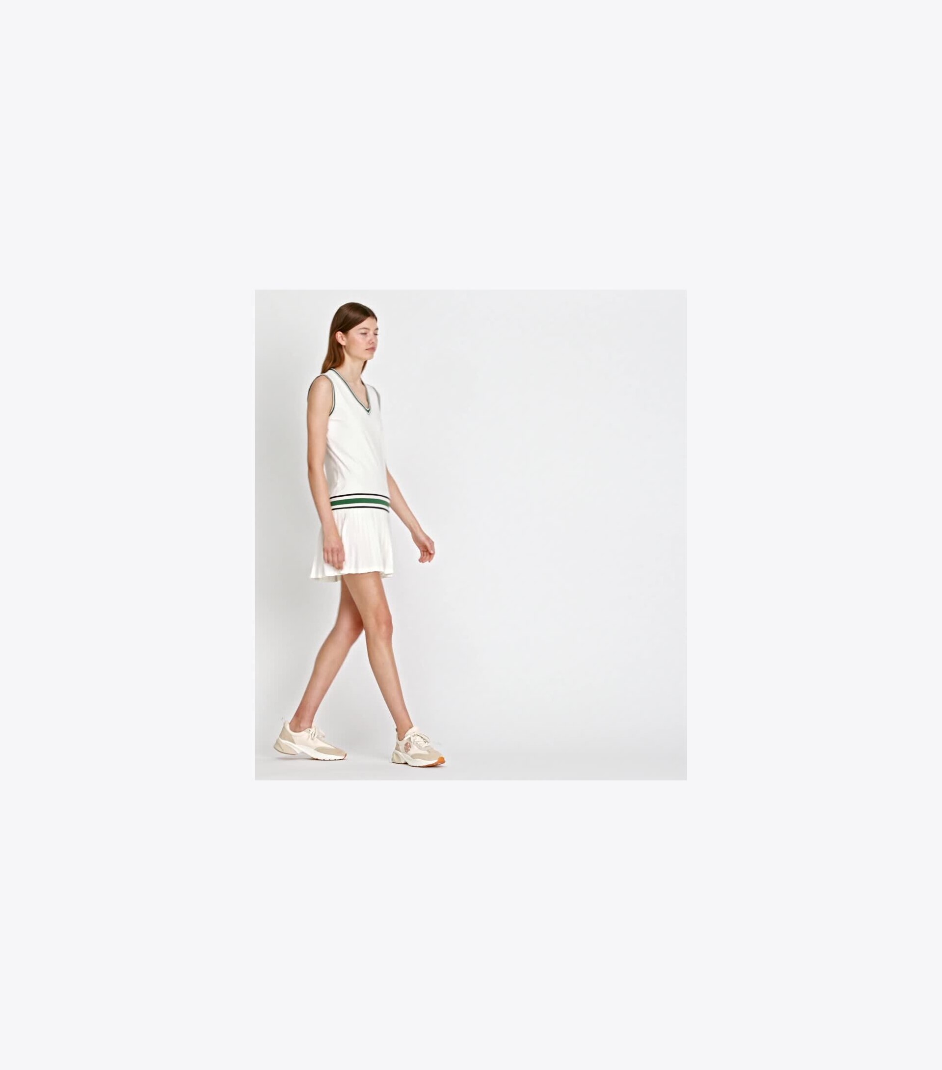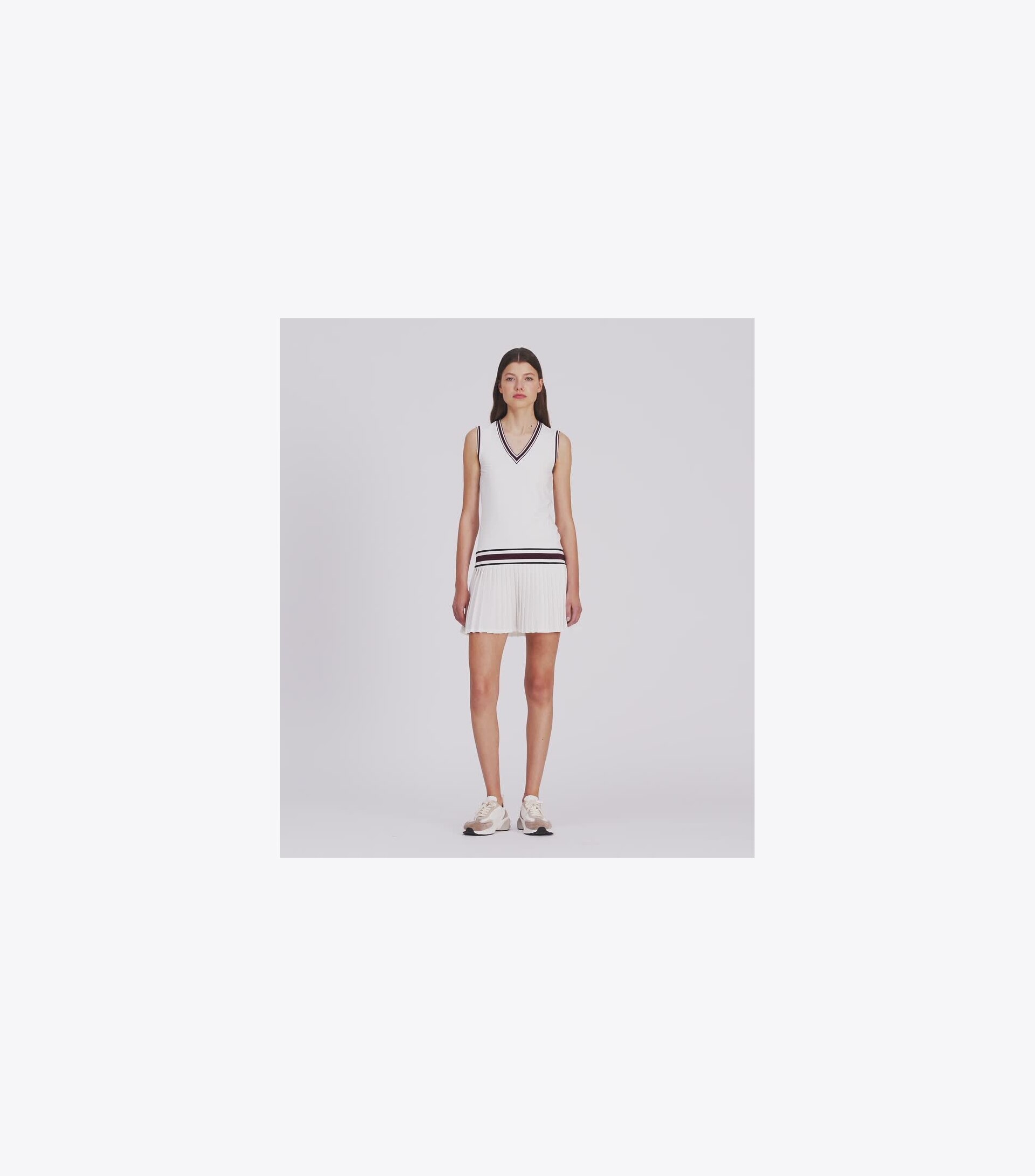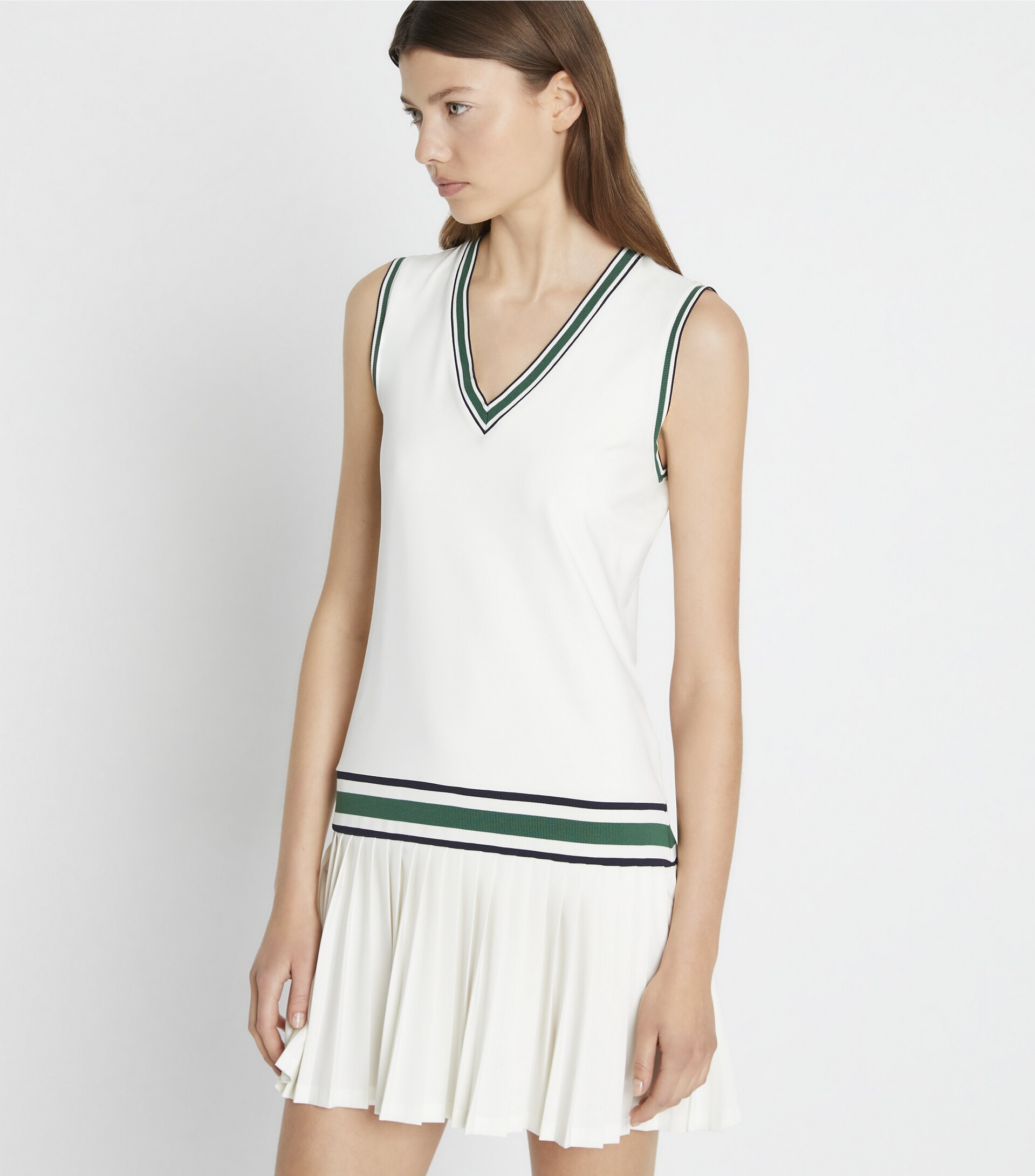Featuring a drop waist and pleated skirt, our v-neck tennis dress is made from performance jersey with a silky-soft feel. It is breathable, moisture wicking and has great stretch and recovery.