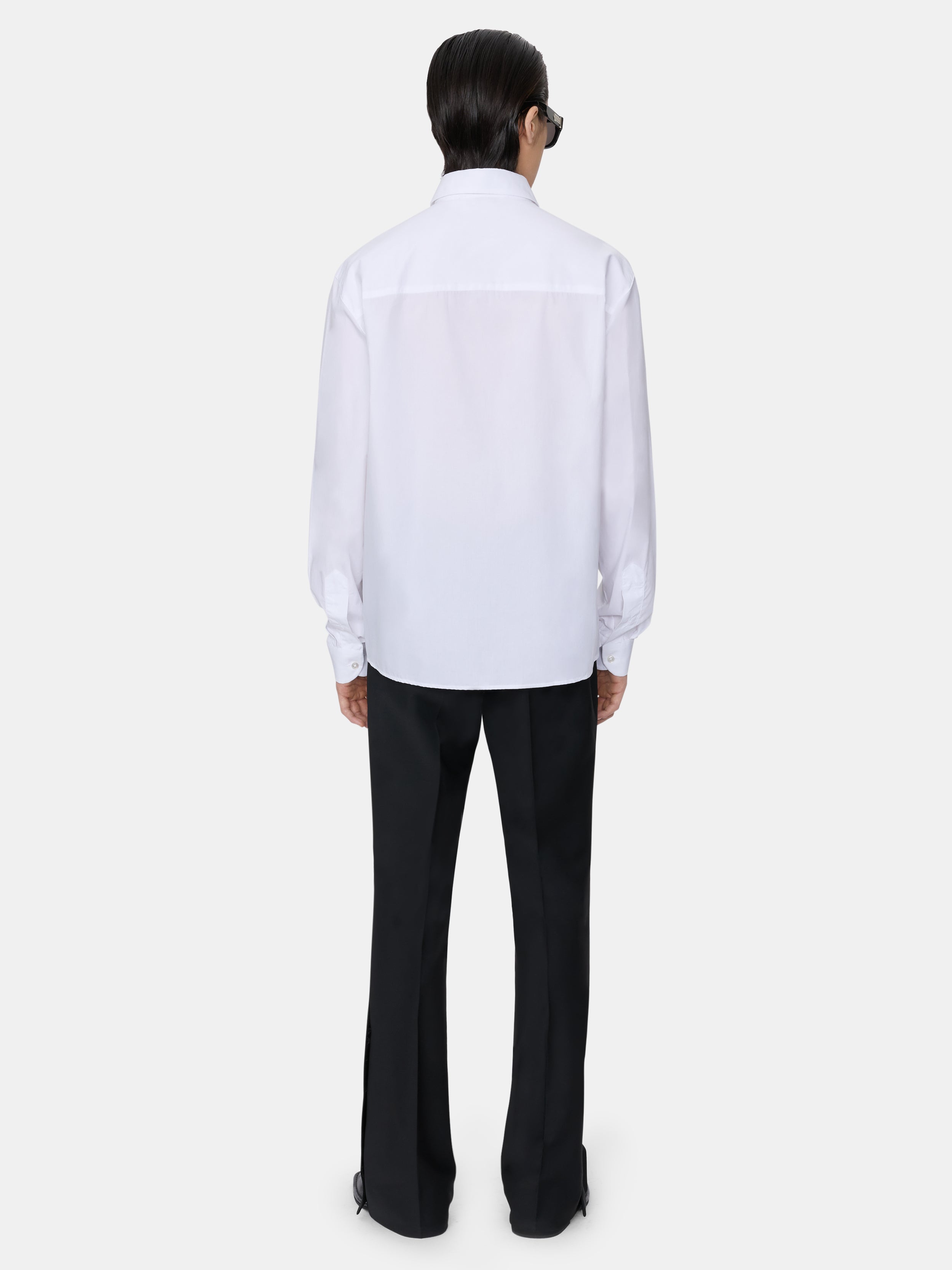 For Spring-Summer 2025, crisp, tailored men's shirting appears as foundational wardrobe cornerstones. The Poplin Dress Shirt is illustrated with tonal MA icon embroidery and finished with a curved hem and button-down closure.