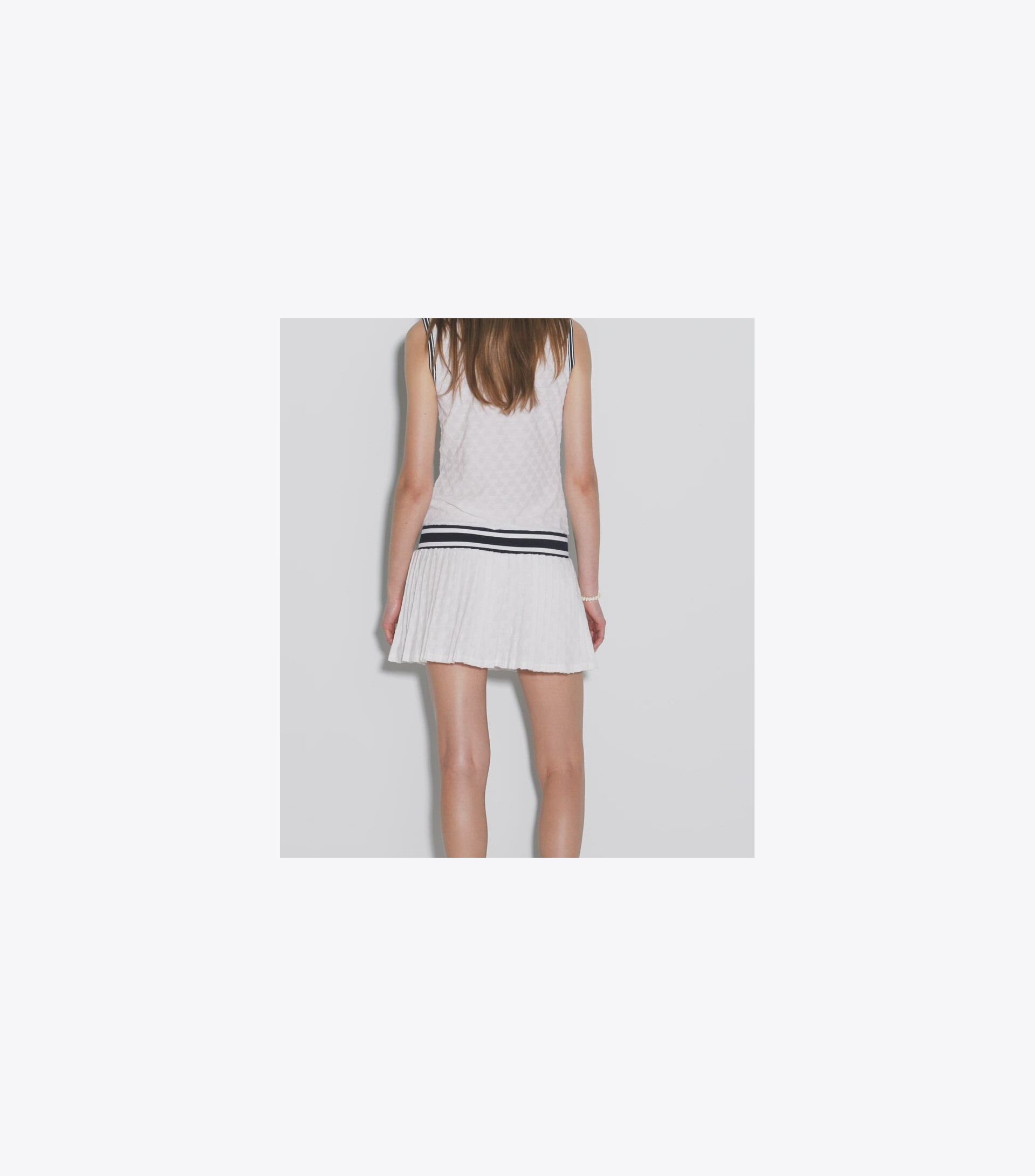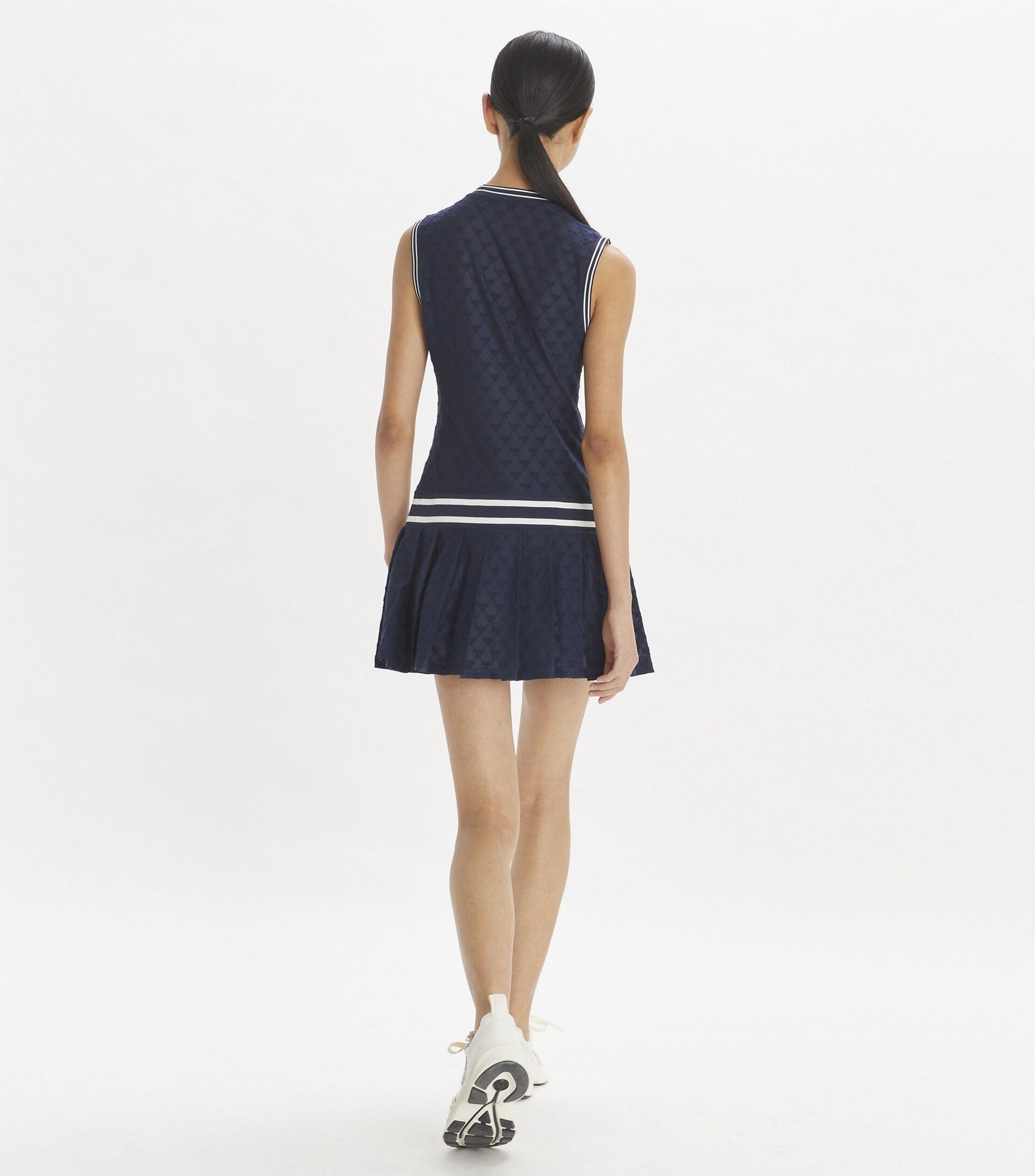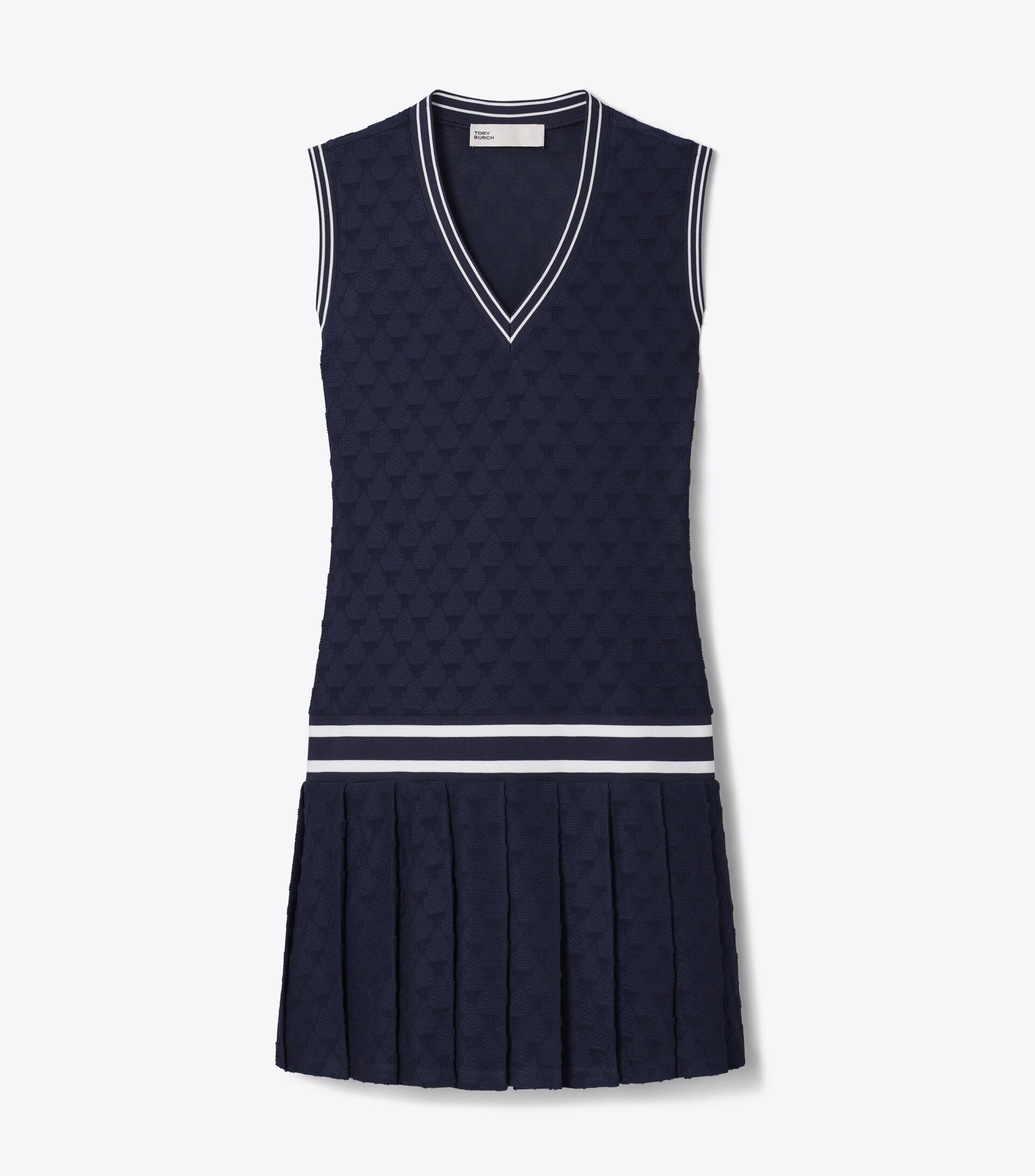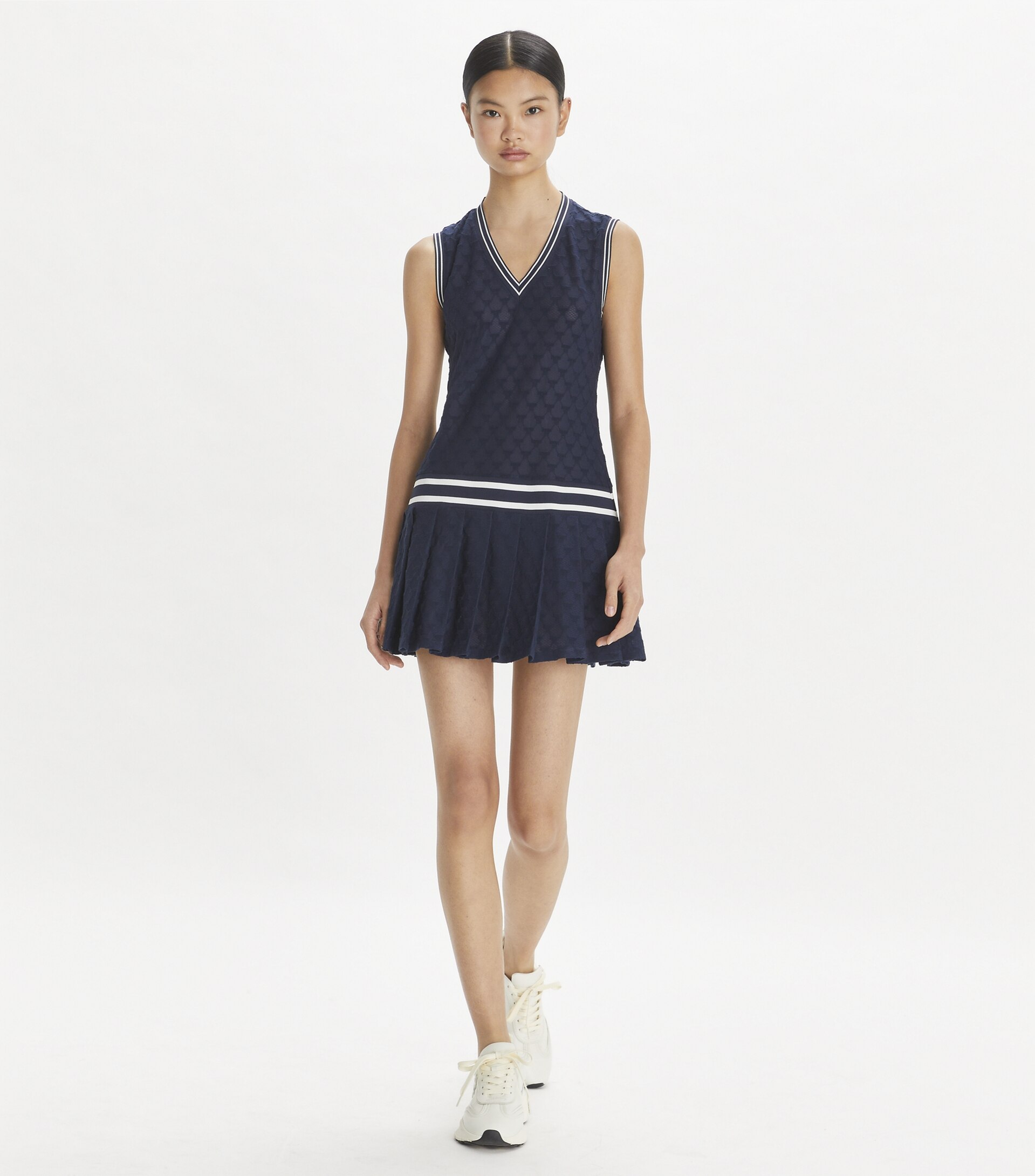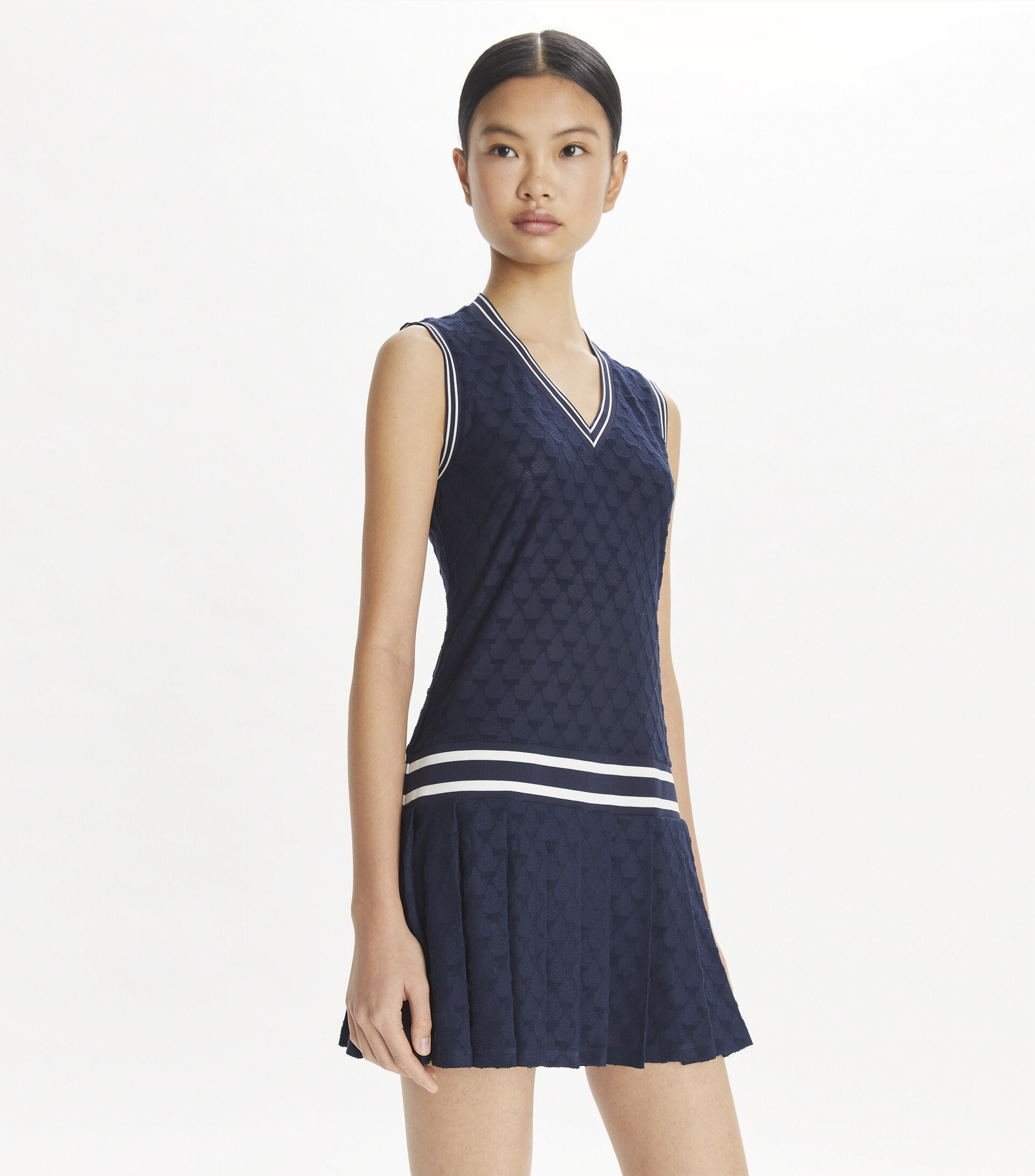 Featuring a drop waist and pleated skirt, our V-neck tennis dress is made in terry jacquard. Cut with a mini length, a removable inner short offers extra coverage.