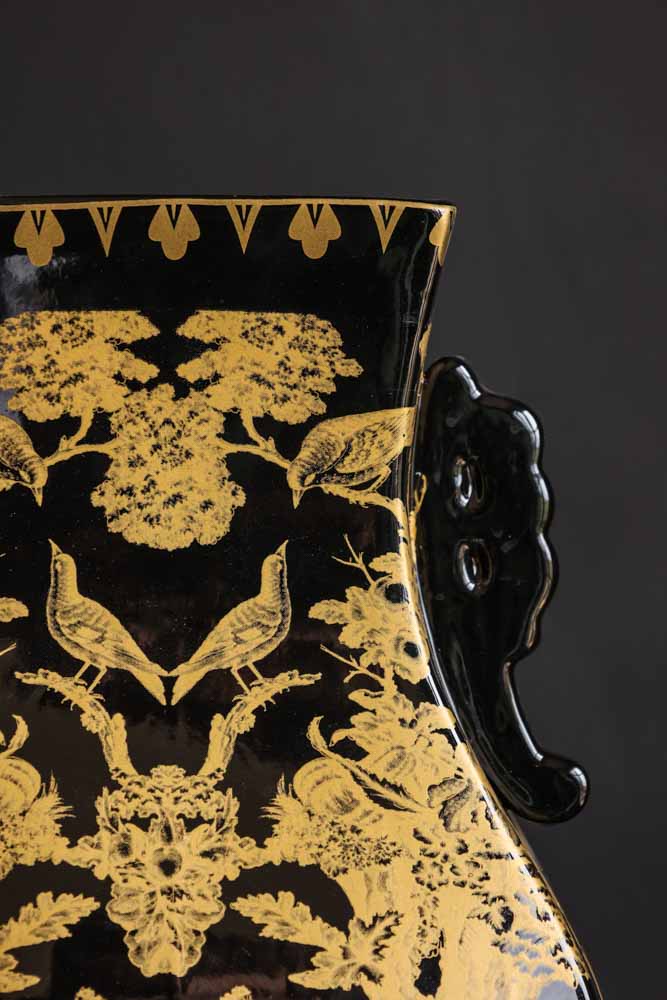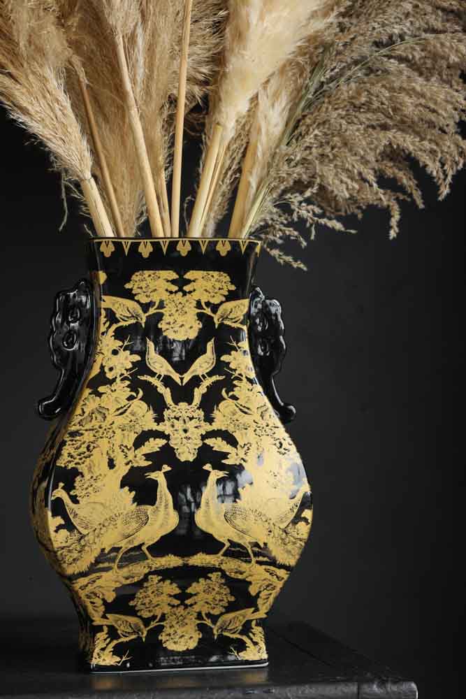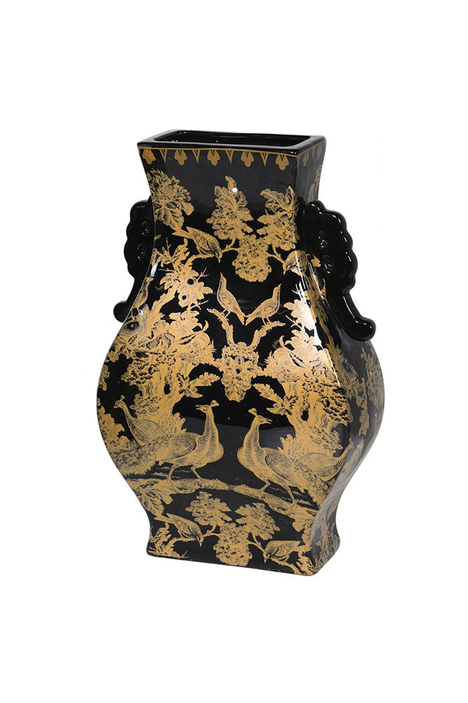 Showcasing an intricate ornate design, the Black and Gold Chinoiserie Porcelain Vase is a beautifully embellished piece. This traditional vase features a delightfully unique curved shape in a grand black and gold chinoiserie symmetrical pattern with elegant peacocks and trees. Adorned with black decorative handles and a wide opening, this porcelain vase would look even better displayed with dramatic wispy stems, elevating the drama of the piece in eye-catching style.