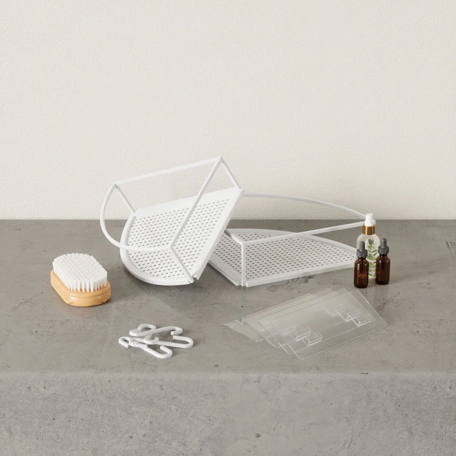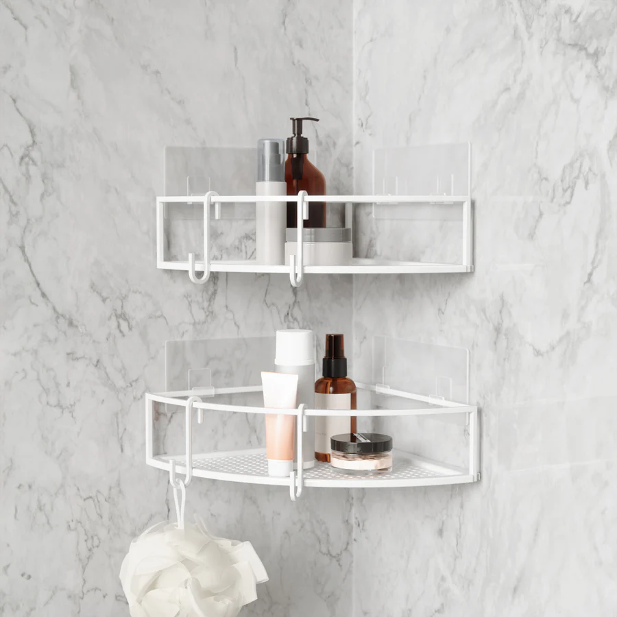 Add elevated storage to your bath or shower space with Cubiko Corner Bins. These non-damaging shower storage caddies have a modern, metal design, making them easy to integrate with a variety of decor styles. Easy to install, Cubiko includes non-damaging, waterproof adhesive strips that can be applied on various surfaces such as tiles, drywall, concrete, etc. (does not work on porous surfaces). Each bin has a max load of 10 lbs (4.5 kg) and is made of rust-free metal. Includes two metal hooks to hold loofahs, small towels, and more. Measures 9.05 x 9.05 x 3 inches (23 x 23 x 8 cm). This corner bin is made with an eco-friendlier finish. It produces 85% less water and solid waste than traditional electroplating finishes. ⓘ Non-Damaging Adhesive Installation: Completely non-damaging to your tiled walls. Cubiko includes a strong adhesive backing that can be applied on various surfaces such as tiles, drywall, concrete, etc. Surfaces must be smooth and clean for mounting. Warning: Surface damage may occur if adhesive mounting is removed from drywall, concrete, wallpaper, and porous surfaces.